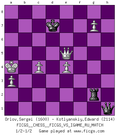 Last move : 1/2-1/2 2007 October 7 15:43:21 [Event "FICGS__CHESS__FICGS_VS_IGAME_RU_MATCH"] [Site "FICGS"] [Date "2007.06.27"] [Round "2"] [White "Orlov,Vladimir"] [Black "Kotlyanskiy,Edward"] [Result "1/2-1/2"] [WhiteElo "1600"] [BlackElo "2114"] 1.e4 c5 2.Nf3 d6 3.d4 cxd4 4.Nxd4 Nf6 5.Nc3 a6 6.Bg5 e6 7.f4 Qc7 8.Bxf6 gxf6 9.Qd2 Nc6 10.O-O-O Bd7 11.Kb1 Nxd4 12.Qxd4 Be7 13.Qd3 O-O-O 14.Be2 Qc5 15.f5 Kb8 16.Bh5 Rdf8 17.Ne2 Rhg8 18.Nd4 e5 19.Nb3 Qb6 20.g3 Rg5 21.Be2 Rc8 22.Nd2 Qf2 23.Rdf1 Qc5 24.Qb3 a5 25.Bc4 a4 26.Qd3 Rg7 27.Rf3 h5 28.Bd5 Bb5 29.c4 Bd7 30.Qe2 Rh8 31.Rd3 Bd8 32.Rd1 Bb6 33.Nf3 Ba5 34.Ka1 Rc8 35.Nd2 Rh8 36.Rb1 Bb4 37.a3 Bxd2 38.Rxd2 Kc7 39.Ka2 h4 40.g4 h3 41.b4 axb3+ 42.Rxb3 b6 43.Rdb2 Rh4 44.Rxb6 Rhxg4 45.Qf3 Qxb6 46.Rxb6 Kxb6 47.Qb3+ Kc7 48.Qb7+ Kd8 49.Bc6 Bxc6 50.Qxc6 Rg2+ 51.Kb3 Rxh2 52.Qxd6+ Ke8 53.Ka4 Ra2 54.Qxf6 h2 55.Qxe5+ Kd7 56.f6 h1Q 57.Qd5+ Kc8 58.fxg7 Rg2 59.Qc6+ Kd8 60.Qd6+ Kc8 61.Qf8+ Kc7 62.Qxf7+ Kb6 63.Qe6+ Kc7 64.Qe5+ Kd7 1/2-1/2 Sicilian : Najdorf, 7.f4 Queenside Castling by player White (move 10) Queenside Castling by player Black (move 13) Promotion Queen by player Black (move 56) 10 pieces endgame at move 58 : White KQPPPP , Black KQRP WHITE : King + 1 Queen 4 Pawns BLACK : King + 1 Queen 1 Rook 1 Pawn 9 pieces endgame at move 62 : White KQPPPP , Black KQR WHITE : King + 1 Queen 4 Pawns BLACK : King + 1 Queen 1 Rook This chess game ended in a draw. Follow this game move after move (download)The passed pawn is a criminal, who should be kept under lock and key. Mild measures, such as police surveillance, are not sufficient. (Nimzovitch) Wenn ich mich einlogge, glauben die Leute gewöhnlich nicht, dass ich es selbst bin und sie fangen an, mir dumme Fragen zu stellen. Und wenn sie es glauben, stellen sie wieder andere dumme Fragen. (Judith Polgar) El Ajedrez es de 30 a 40 por ciento psicología. Uno no cuenta con esto cuando se juega contra una computadora. No lo puedo confundir. (Judith Polgar) Karpov est une pièce de musée. (Garry Kasparov) Always two there are. No more no less. A master, and an apprentice. (Master Yoda in Star Wars ep.1)