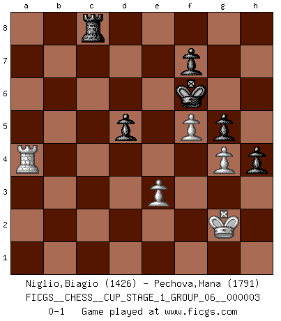 Last move : 0-1 2020 March 14 20:2:27 [Event "FICGS__CHESS__CUP_STAGE_1_GROUP_06__000003"] [Site "FICGS"] [Date "2019.11.02"] [Round "1"] [White "Niglio,Biagio"] [Black "Pechova,Hana"] [Result "0-1"] [WhiteElo "1426"] [BlackElo "1791"] 1.Nf3 Nf6 2.d4 d5 3.Bf4 Bf5 4.e3 e6 5.Bd3 Bxd3 6.Qxd3 c5 7.c3 Nc6 8.Nbd2 Bd6 9.Bg3 Bxg3 10.hxg3 Qb6 11.dxc5 Qxb2 12.Rb1 Qxa2 13.Rxb7 O-O 14.O-O Qa3 15.Nb3 Ne4 16.Nfd4 Nxc5 17.Nxc5 Qxc5 18.Nb3 Qd6 19.Qa6 Rab8 20.Rxb8 Qxb8 21.Qxc6 Qxb3 22.Ra1 Rb8 23.Qc7 h6 24.Qxa7 Rc8 25.Ra3 Qb1+ 26.Kh2 Qb2 27.Ra2 Qxc3 28.Qd7 Rb8 29.Ra7 Qf6 30.f3 Qf5 31.g4 Qe5+ 32.f4 Qf6 33.Kg3 g5 34.f5 Rd8 35.Qe7 Qxe7 36.Rxe7 exf5 37.gxf5 Kg7 38.Kf3 Kf6 39.Ra7 h5 40.g4 h4 41.Ra4 Rh8 42.Kg2 Rc8 0-1 Reti Opening Kingside Castling by player Black (move 13) Kingside Castling by player White (move 14) Player Black won this chess game. Follow this game move after move (download)It is difficult to play against Einstein's theory --on his first loss to Fischer. (Mikhail Tal) Wenn man heute mit 14 Jahren noch kein GM ist, kann man es vergessen. (Viswanathan Anand) Los asuntos humanos son como una partida de Ajedrez: solo aquellos que no lo toman seriamente, pueden ser llamados buenos jugadores. (Hung Tzu Ch'eng) Ce qui caractérise les parties de combat, c'est que si le défenseur a constamment de difficiles problèmes à résoudre, l'attaquant doit chercher sans relâche de nouvelles possibilités d'attaque. (Koblentz) Industry executives and analysts often mistakenly talk about strategy as if it were some kind of chess match. But in chess, you have just two opponents, each with identical resources, and with luck playing a minimal role. The real world is much more like a poker game, with multiple players trying to make the best of whatever hand fortune has dealt them. In our industry, Bill Gates owns the table until someone proves otherwise. (David Moschella, 'Computerworld')