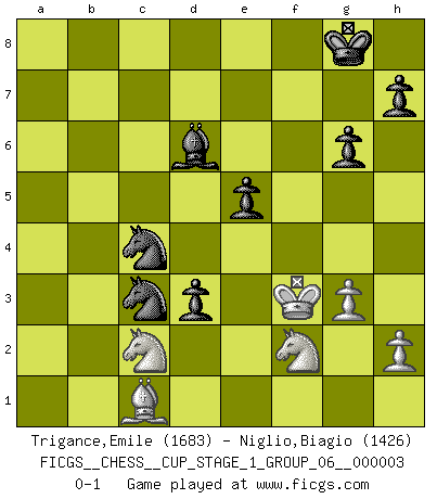 Last move : 0-1 2020 February 13 10:44:59 [Event "FICGS__CHESS__CUP_STAGE_1_GROUP_06__000003"] [Site "FICGS"] [Date "2019.11.02"] [Round "1"] [White "Trigance,Emile"] [Black "Niglio,Biagio"] [Result "0-1"] [WhiteElo "1683"] [BlackElo "1426"] 1.Nf3 Nf6 2.g3 g6 3.b4 Bg7 4.Bb2 d5 5.Bg2 O-O 6.O-O Qd6 7.a3 Nbd7 8.d3 a5 9.Bc3 b6 10.Nbd2 e5 11.e3 Bb7 12.Rb1 axb4 13.Bxb4 c5 14.Bc3 Rxa3 15.Bb2 Ra2 16.c4 d4 17.e4 Rfa8 18.Qb3 Qc6 19.Ra1 Qa4 20.Rxa2 Qxa2 21.Ra1 Qxb3 22.Nxb3 Rxa1+ 23.Nxa1 Ne8 24.Nc2 Nd6 25.Bc1 b5 26.cxb5 Nxb5 27.Nfe1 Nc3 28.Kf1 Nb6 29.Bd2 c4 30.Nb4 Nb1 31.Bc1 Nc3 32.Bd2 Bf8 33.Nec2 cxd3 34.Nxd3 Bxe4 35.Bxe4 Nxe4 36.Bc1 f6 37.f4 Nc4 38.fxe5 fxe5 39.Kg2 Bd6 40.Kf3 Nc3 41.Nf2 d3 0-1 Reti : King's Indian attack, Reti-Smyslov variation Kingside Castling by player Black (move 5) Kingside Castling by player White (move 6) Player Black won this chess game. Follow this game move after move (download)The winner of the game is the player who makes the next-to-last mistake. (Savielly Tartakover) In der Schule lernt man nichts. Es ist nur Zeitverschwendung. (Robert James Fischer) Combinaciones deslumbrantes son para la mayoría, mover madera es para los pocos. (Georg Kieninger) Même un GMI sait rarement calculer sur plus de cinq coups une attaque à sacrifices. (Rudolf Spielmann) Beep ! (R2D2 in Star Wars ep.3)