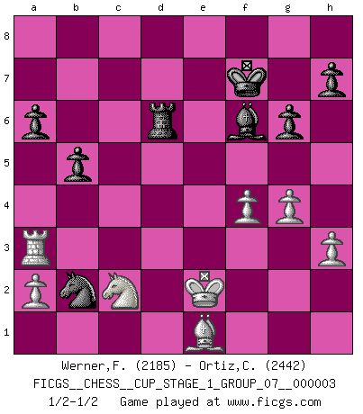 Last move : 1/2-1/2 2020 January 29 10:13:14 [Event "FICGS__CHESS__CUP_STAGE_1_GROUP_07__000003"] [Site "FICGS"] [Date "2019.11.02"] [Round "1"] [White "Werner,Frank-Karl"] [Black "Ortiz,Clodomiro"] [Result "1/2-1/2"] [WhiteElo "2185"] [BlackElo "2442"] 1.c4 e5 2.g3 c6 3.Nf3 e4 4.Nd4 d5 5.cxd5 Qxd5 6.Nc2 Nf6 7.Nc3 Qe5 8.Bg2 Na6 9.O-O Be7 10.d3 exd3 11.Qxd3 O-O 12.Rd1 Re8 13.e4 Qh5 14.f3 Nc5 15.Qd2 Nfd7 16.f4 Nb6 17.Ne3 Bh3 18.Bxh3 Qxh3 19.Qg2 Qxg2+ 20.Kxg2 Rad8 21.Rxd8 Rxd8 22.e5 g6 23.Rb1 f5 24.exf6 Bxf6 25.b4 Nca4 26.Ne4 Be7 27.Kf3 Rd4 28.Bd2 Kf7 29.Nc2 Rd8 30.Ne3 Rd4 31.Nc2 Rd8 32.Ke2 Nc4 33.Rb3 b5 34.Be1 a6 35.h3 Nd6 36.Nxd6+ Rxd6 37.Re3 Bf6 38.g4 c5 39.bxc5 Nxc5 40.Bd2 Na4 41.Ra3 Nb2 42.Be1 Be7 43.Bb4 Rc6 44.Rc3 Re6+ 45.Re3 Bf6 46.Be1 Rd6 47.Ra3 1/2-1/2 English Opening Kingside Castling by player White (move 9) Kingside Castling by player Black (move 11) This chess game ended in a draw. Follow this game move after move (download)A sacrifice is best refuted by accepting it. (Wilhelm Steinitz) Über die Verhaftung Bobby Fischers: Warum es die Bush-Administration für nötig befindet einen 61 Jahre alten Mann zu hetzten, der für niemanden ausser sich selbste eine Gefahr darstellt ist ein Rätsel. (Nigel Short) En la vida, como en el Ajedrez, los Peones propios obstruyen nuestro camino. La gran fortuna de un hombre, su comodidad, placer, hijos, libros, que deberían ayudarle a ganar, con mucha frecuencia lo ponen en Jaque Mate. (Charles Buxton) Un millionnaire : 'Monsieur Steinitz ! Vous ne participez aux tournois que pour l'argent, alors que moi je n'y viens que pour l'honneur.' Steinitz : 'Chacun joue pour ce qu'il n'a pas'... Even the best needles are not sharp at both ends. (Chinese proverb)