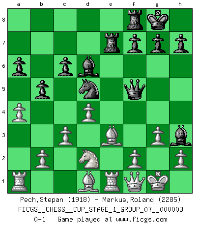 Last move : 0-1 2020 January 22 1:4:19 [Event "FICGS__CHESS__CUP_STAGE_1_GROUP_07__000003"] [Site "FICGS"] [Date "2019.11.02"] [Round "1"] [White "Pech,Stepan"] [Black "Markus,Roland"] [Result "0-1"] [WhiteElo "1918"] [BlackElo "2285"] 1.e4 e5 2.Nf3 Nc6 3.Bb5 a6 4.Ba4 Nf6 5.O-O Be7 6.Re1 b5 7.Bb3 O-O 8.c3 d5 9.exd5 Nxd5 10.Nxe5 Nxe5 11.Rxe5 c6 12.d4 Bd6 13.Re1 Qh4 14.g3 Qh3 15.Be3 Bg4 16.Qd3 Rae8 17.Nd2 Qh5 18.Qf1 Re7 19.a4 Bh3 20.Bd1 Qf5 0-1 This chess game has been lost on time (started : 2019.11.02 13:52:32) Clodomiro Ortiz why white stops playing a favourable position Ruy Lopez : Closed, 7...O-O Kingside Castling by player White (move 5) Kingside Castling by player Black (move 7) Player Black won this chess game. Follow this game move after move (download)Many Chess players were surprised when after the game, Fischer quietly explained: 'I had already analyzed this possibility' in a position which I thought was not possible to foresee from the opening. (Mikhail Tal) Intelligenz läßt sich nicht am Weg, sondern nur am Ergebnis feststellen. (Garry Kasparov) El tablero es el mundo, las piezas es el fenomeno del universo, las reglas del juego son lo que llamamos leyes de la naturaleza y el jugador del lado opuesto, se encuentra oculto a nuestra vista. (Thomas Huxley) Dieu déplace le joueur, et celui-ci la pièce. Quel Dieu derrière Dieu commence donc la trame ? Arturo Perez-Reverte (prix de littérature policière 1993). Ah, beer! The cause of, and the solution to, all of life's problems. (Homer Simpson)