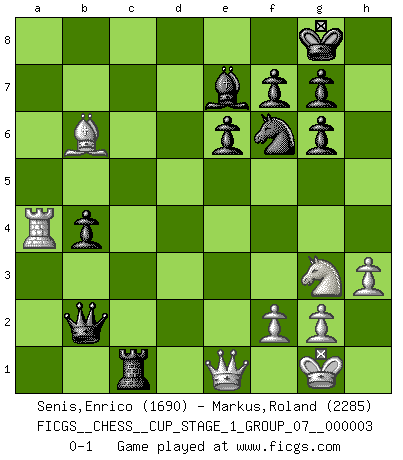 Last move : 0-1 2019 December 30 23:41:49 [Event "FICGS__CHESS__CUP_STAGE_1_GROUP_07__000003"] [Site "FICGS"] [Date "2019.11.02"] [Round "1"] [White "Senis,Enrico"] [Black "Markus,Roland"] [Result "0-1"] [WhiteElo "1690"] [BlackElo "2285"] 1.e4 c6 2.d4 d5 3.Nc3 dxe4 4.Nxe4 Bf5 5.Ng3 Bg6 6.Nf3 Nd7 7.Bd3 e6 8.Bxg6 hxg6 9.Ng5 Be7 10.Nf3 Ngf6 11.Bf4 Qb6 12.Rb1 Qa5+ 13.c3 Qxa2 14.O-O c5 15.Qc2 cxd4 16.cxd4 O-O 17.Ra1 Qd5 18.h3 Rfc8 19.Qd2 a5 20.Qe1 a4 21.Qd2 b5 22.Rfc1 Rxc1+ 23.Qxc1 b4 24.Bd2 Nb6 25.Ne5 Rc8 26.Qe1 Qxd4 27.Be3 Qxe5 28.Bxb6 Qxb2 29.Rxa4 Rc1 0-1 Caro-Kann : Classical variation Kingside Castling by player White (move 14) Kingside Castling by player Black (move 16) Player Black won this chess game. Follow this game move after move (download)In blitz, the Knight is stronger than the Bishop. (Vlastimil Hort) Darum geht es im Schach. Einen Tag gibst du deinem Gegner eine Lektion, am nächsten Tag gibt er dir eine. (Robert James Fischer) Los asuntos humanos son como una partida de Ajedrez: solo aquellos que no lo toman seriamente, pueden ser llamados buenos jugadores. (Hung Tzu Ch'eng) Des idées, des idées, j'en ai cent, j'en ai mille. Des bonnes, des mauvaises, applicables, irréalisables... Il suffit de faire le tri ! (Roos) If you lose the game you should win the analysis! (Proverb)