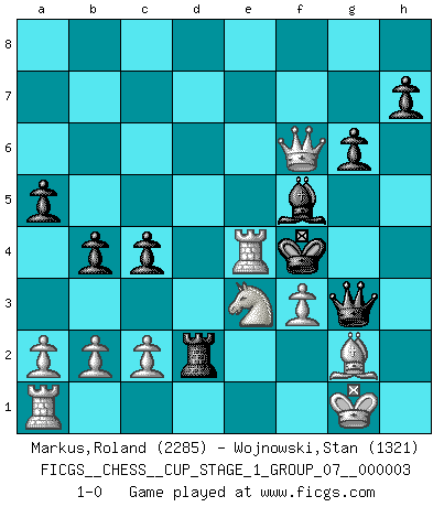 Last move : 1-0 2020 January 10 14:35:1 [Event "FICGS__CHESS__CUP_STAGE_1_GROUP_07__000003"] [Site "FICGS"] [Date "2019.11.02"] [Round "1"] [White "Markus,Roland"] [Black "Wojnowski,Stan"] [Result "1-0"] [WhiteElo "2285"] [BlackElo "1321"] 1.e4 c5 2.Ne2 d6 3.Nbc3 Nc6 4.g3 Nf6 5.Bg2 g6 6.O-O Bg7 7.d3 O-O 8.h3 a6 9.Be3 b5 10.e5 Nxe5 11.Bxa8 Bxh3 12.Bg2 Bg4 13.f3 Bd7 14.Qd2 b4 15.Nd1 a5 16.Bh6 Qb6 17.Bxg7 Kxg7 18.Ne3 d5 19.d4 Nc4 20.Nxc4 dxc4 21.Rfe1 cxd4 22.Qxd4 Qc7 23.Nf4 Re8 24.Nd5 Qxg3 25.Rxe7 Bh3 26.Qxf6+ Kh6 27.Ne3 Rd8 28.Qxf7 Rd2 29.Qg7+ Kg5 30.Re5+ Kf4 31.Qf6+ Bf5 32.Re4+ 1-0 Sicilian : Keres variation (2.Ne2) Kingside Castling by player White (move 6) Kingside Castling by player Black (move 7) Player White won this chess game. Follow this game move after move (download)Kasparov : J'adoube , Ivanchuk : S'il vous plaît ! (Garry Kasparov & Vassily Ivanchuk, Linares 1997) Wenn ich einen Club besuche, sind die Spieler stumm vor Staunen. (José Raúl Capablanca) Nos gusta pensar. (Gary Kasparov) Le temps de noter son nom sur la feuille de partie, j'étais déjà en zeitnot ! D'un modeste amateur apparié lors de la première ronde d'un open contre le grand-maître Azmaïparashvili. Hello Thibault, if I have had a plan (and I had one, I hope), I have forgotten it during the last week... - Hello Heinz-Georg. What do you mean a plan ? (Anonymous players, during a Big Chess game)
