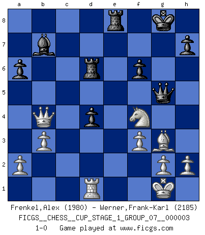 Last move : 1-0 2020 January 3 18:39:56 [Event "FICGS__CHESS__CUP_STAGE_1_GROUP_07__000003"] [Site "FICGS"] [Date "2019.11.02"] [Round "1"] [White "Frenkel,Alex"] [Black "Werner,Frank-Karl"] [Result "1-0"] [WhiteElo "1980"] [BlackElo "2185"] 1.e4 e5 2.Nf3 Nc6 3.Bb5 a6 4.Ba4 Nf6 5.O-O Nxe4 6.d4 Be7 7.Re1 b5 8.Rxe4 d5 9.Nxe5 Nxe5 10.Rxe5 bxa4 11.Nc3 O-O 12.Rxd5 Bd6 13.Bg5 Qe8 14.Qd3 Rb8 15.b3 axb3 16.cxb3 Bb7 17.Rf5 f6 18.Bh4 Rf7 19.Bg3 g6 20.Bxd6 gxf5 21.Bg3 Re7 22.f3 f4 23.Bh4 Rd8 24.Rf1 Rd6 25.Qd2 Qg6 26.Ne2 c5 27.Nxf4 Qh6 28.Bf2 cxd4 29.Rd1 Re8 30.Bg3 Qg5 31.Qb4 1-0 This chess game has been lost on time (started : 2019.11.02 13:52:32) Ruy Lopez : Open, 6.d4 Kingside Castling by player White (move 5) Kingside Castling by player Black (move 11) Player White won this chess game. Follow this game move after move (download)The mistakes are there, waiting to be made. (Savielly Tartakower) Nicht daß Diemer aus Opportunismus Mitglied der NSDAP geworden wäre. Er war ein Fanatiker, in allem, was er tat. (Hans Ree) El Ajedrez es un invernadero donde los frutos del carácter pueden madurar mas completamente que en la vida. (Edward Morgan Foster) J'ai toujours senti une vague pitié pour l'homme qui ne connaît rien aux échecs, tout comme j'en aurais pour un homme ignorant de l'amour. Les Echecs, comme la musique ou comme l'amour, ont le pouvoir de rendre heureux. (Siegbert Tarrasch) Life is like a game of cards: the hand you are dealt represents determinism; the way you play it is free will. (Jawaharlal Nehru)