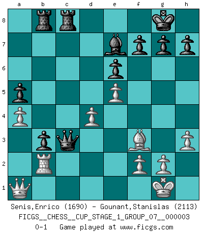 Last move : 0-1 2019 November 29 9:4:28 [Event "FICGS__CHESS__CUP_STAGE_1_GROUP_07__000003"] [Site "FICGS"] [Date "2019.11.02"] [Round "1"] [White "Senis,Enrico"] [Black "Gounant,Stanislas"] [Result "0-1"] [WhiteElo "1690"] [BlackElo "2113"] 1.d4 d5 2.c4 c6 3.Nf3 Nf6 4.Bf4 dxc4 5.Nc3 e6 6.e3 b5 7.a3 Bb7 8.Be2 Be7 9.O-O a6 10.b3 cxb3 11.Qxb3 Nbd7 12.Rfd1 Qc8 13.e4 c5 14.e5 c4 15.Qb2 Nd5 16.Nxd5 Bxd5 17.Rac1 Nb6 18.Rd2 Na4 19.Qa1 a5 20.Rb1 b4 21.Bd1 b3 22.Rdb2 Nxb2 23.Rxb2 Rb8 24.Bd2 c3 25.Bxc3 Qxc3 26.h3 O-O 27.a4 Bxf3 28.Bxf3 Rfc8 0-1 QGD Slav : 3.Nf3 Kingside Castling by player White (move 9) Kingside Castling by player Black (move 26) Player Black won this chess game. Follow this game move after move (download)When your house is on fire, you can't be bothered with the neighbors. Or, as we say in Chess, if your King is under attack you don't worry about losing a Pawn on the Queen's side. (Gary Kasparov) Sehr viele beherrschen heutzutage das große Einmalseins des Schachspiels und kennen sogar dessen Logarithmentafeln auswendig - deshalb sollte man hin und wieder zu beweisen trachten, dass zwei mal zwei auch fünf sein kann. (Mikhail Nekhemyevich Tal) El Ajedrez es tan inspirador que yo no creo que un buen jugador sea capaz de tener un pensamiento malo durante una partida. (Wilhelm Steinitz) On a dit que l'homme se distingue de l'animal par le fait qu'il achète plus de livres qu'il ne peut en lire. Je voudrais suggérer qu'inclure à la liste des livres quelques livres d'échecs rendrait la distinction manifeste. (Edward Lasker) Just because you do not take an interest in politics doesn't mean politics won't take an interest in you. (Pericles 430 B.C.)