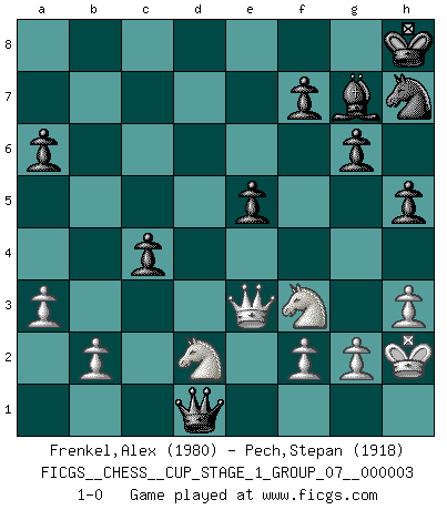 Last move : 1-0 2020 January 14 4:43:59 [Event "FICGS__CHESS__CUP_STAGE_1_GROUP_07__000003"] [Site "FICGS"] [Date "2019.11.02"] [Round "1"] [White "Frenkel,Alex"] [Black "Pech,Stepan"] [Result "1-0"] [WhiteElo "1980"] [BlackElo "1918"] 1.e4 e5 2.Nf3 Nc6 3.Bb5 a6 4.Ba4 Nf6 5.O-O Be7 6.Re1 b5 7.Bb3 d6 8.c3 O-O 9.h3 Re8 10.d4 Bb7 11.Nbd2 Bf8 12.a3 g6 13.d5 Nb8 14.Nf1 Nbd7 15.Ng3 Nc5 16.Ba2 c6 17.dxc6 Bxc6 18.Bg5 Bg7 19.Nh2 h5 20.Qf3 Ne6 21.Qe3 Qc7 22.Rad1 Rad8 23.Nf3 Nxg5 24.Qxg5 d5 25.Nh4 Nh7 26.Qc1 Qb7 27.Rd3 Rd7 28.Qe3 Red8 29.Red1 Nf6 30.Qg5 Nh7 31.Qe3 Kh8 32.Nf3 dxe4 33.Rxd7 Rxd7 34.Rxd7 Qxd7 35.Nxe4 Qd1+ 36.Kh2 Bd5 37.c4 Bxc4 38.Bxc4 bxc4 39.Ned2 1-0 This chess game has been lost on time (started : 2019.11.02 13:52:32) Ruy Lopez : Closed Kingside Castling by player White (move 5) Kingside Castling by player Black (move 8) Player White won this chess game. Follow this game move after move (download)You know you're going to lose. Even when I was ahead I knew I was going to lose. - On playing against Fischer. (Andrew Soltis) Karpov ist ein Museumsstück. (Garry Kasparov) ¡Examina movidas que hagan daño! Un buen ojo for movidas desvastantes es mucho mas importante que el conocimiento de principios estratégicos. (Purdy) Aux échecs, l'amour-propre est satisfait quand on remporte la victoire, mais il n'y a pas de honte à être battu. (Benjamin Franklin) Panic is a sudden desertion of us, an a going over to the enemy of our imagination. (Christian Nevell Bovee)