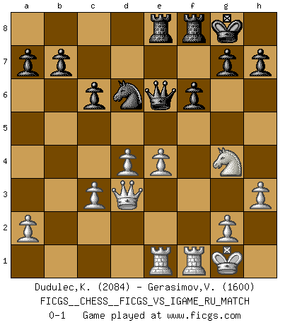 Last move : 0-1 2007 November 1 11:42:54 [Event "FICGS__CHESS__FICGS_VS_IGAME_RU_MATCH"] [Site "FICGS"] [Date "2007.06.27"] [Round "1"] [White "Dudulec,Konstantin"] [Black "Gerasimov,Vladimir"] [Result "0-1"] [WhiteElo "2084"] [BlackElo "1600"] 1.Nf3 Nf6 2.c4 e6 3.Nc3 d5 4.d4 c6 5.Bg5 Nbd7 6.cxd5 exd5 7.e3 Be7 8.Bd3 Ne4 9.Bxe7 Qxe7 10.O-O O-O 11.Qc2 Ndf6 12.Rae1 Bf5 13.Ne5 Nxc3 14.bxc3 Bxd3 15.Qxd3 Ne4 16.f3 Nd6 17.e4 f6 18.Ng4 dxe4 19.fxe4 Qe6 20.h3 Rae8 0-1 Reti Opening Kingside Castling by player White (move 10) Kingside Castling by player Black (move 10) Player Black won this chess game. Follow this game move after move (download)When asked, -How is that you pick better moves than your opponents?, I responded: I'm very glad you asked me that, because, as it happens, there is a very simple answer. I think up my own moves, and I make my opponent think up his. (Alexander Alekhine) Modernes Schach sorgt sich zuviel um Dinge wie Bauernstruktur usw. Vergessen Sie das, Schachmatt beendet das Spiel! (Nigel Short) Hay jugadores fuertes y personas amables y yo soy un jugador fuerte. (Bobby Fischer) Le jeu d'échecs est comme rejeté hors du temps. (Antoine de Saint-Exupéry) Plans are ideas that never come to fruition. (Daniel Parmet)