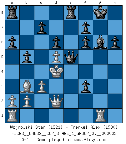 Last move : 0-1 2019 November 20 21:53:38 [Event "FICGS__CHESS__CUP_STAGE_1_GROUP_07__000003"] [Site "FICGS"] [Date "2019.11.02"] [Round "1"] [White "Wojnowski,Stan"] [Black "Frenkel,Alex"] [Result "0-1"] [WhiteElo "1321"] [BlackElo "1980"] 1.e4 e5 2.Nf3 Nc6 3.Bb5 a6 4.Ba4 Nf6 5.O-O Be7 6.Re1 b5 7.Bb3 O-O 8.c3 d6 9.h3 Nb8 10.d4 Nbd7 11.Bg5 Bb7 12.Nbd2 h6 13.Bh4 Re8 14.d5 Nh5 15.Bxe7 Qxe7 16.Nf1 Reb8 17.Ne3 Bc8 18.Nf5 Qf8 19.Nh2 Ndf6 20.Ng4 Bxf5 21.Nxf6+ Nxf6 22.g4 Bxe4 23.h4 Qc8 24.f3 Bg6 25.Kf2 e4 26.g5 Qh3 27.gxf6 Qxh4+ 28.Ke3 gxf6 29.Qd4 Re8 30.Qd2 Qg3 31.Kd4 exf3 32.Rg1 Qe5+ 0-1 Ruy Lopez : Closed, 7...O-O Kingside Castling by player White (move 5) Kingside Castling by player Black (move 7) Player Black won this chess game. Follow this game move after move (download)Fischer Chess play was always razor-sharp, rational and brilliant. One of the best ever. (Dave Regis) Mit Schach schule ich mein Gefühl für Geometrie, was für Tennis und Schach gleichermaßen wichtig ist. (Boris Becker) Un mal plan es mejor que no tener ningún plan. (Frank Marshall) L'attaque fait le spectacle, la défense gagne les matchs. (Dicton footballistique) Waiting for chance ? Play in casinos. (FICGS proverb)