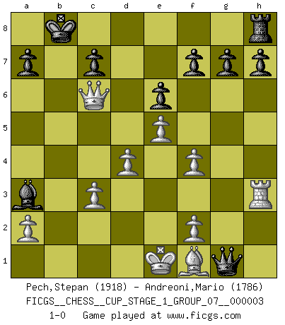 Last move : 1-0 2020 January 7 19:47:9 [Event "FICGS__CHESS__CUP_STAGE_1_GROUP_07__000003"] [Site "FICGS"] [Date "2019.11.02"] [Round "1"] [White "Pech,Stepan"] [Black "Andreoni,Mario"] [Result "1-0"] [WhiteElo "1918"] [BlackElo "1786"] 1.d4 d5 2.c4 Nc6 3.Nc3 Nf6 4.Nf3 Bg4 5.cxd5 Bxf3 6.gxf3 Nxd5 7.e4 Nxc3 8.bxc3 e6 9.Rg1 Qh4 10.Rb1 O-O-O 11.Qa4 Rd6 12.Rg3 Qxh2 13.Bf4 Qh1 14.Bxd6 Bxd6 15.Rxb7 Kxb7 16.Rh3 Qg1 17.Qa6+ Kb8 18.Qb5+ Kc8 19.Qxc6 Kb8 20.e5 Ba3 21.f4 1-0 QGD : Chigorin defense Queenside Castling by player Black (move 10) Player White won this chess game. Follow this game move after move (download)Good offense and good defense both begin with good development. (Bruce A. Moon) Im Fernschach kannst du während dem Spiel rauchen. (John Christen Knudsen) La única cosa que los jugadores de Ajedrez tienen en común, es el Ajedrez. (Lodewijk Prins) On est toujours la mazette de quelqu'un d'autre. (Anonyme) A good book on your shelf is a friend that turns its back on you and remains a friend. (Author unknown)