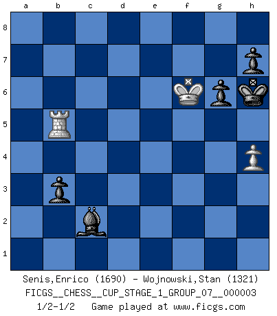 Last move : 1/2-1/2 2020 January 17 8:33:3 [Event "FICGS__CHESS__CUP_STAGE_1_GROUP_07__000003"] [Site "FICGS"] [Date "2019.11.02"] [Round "1"] [White "Senis,Enrico"] [Black "Wojnowski,Stan"] [Result "1/2-1/2"] [WhiteElo "1690"] [BlackElo "1321"] 1.e4 c5 2.Nf3 d6 3.d4 cxd4 4.Nxd4 Nf6 5.Nc3 g6 6.f3 Bg7 7.Be3 O-O 8.Qd2 Nc6 9.Nb3 Be6 10.O-O-O Rc8 11.Kb1 Na5 12.Nd4 Bc4 13.g3 Re8 14.Bh3 e6 15.g4 Nd7 16.f4 e5 17.Ndb5 exf4 18.Bxf4 Ne5 19.Nxd6 Nf3 20.Qe3 Ne5 21.Nxc8 Qxc8 22.g5 Ng4 23.Qxa7 Nc6 24.Qg1 Bxc3 25.Bxg4 Qa8 26.a3 Bg7 27.e5 Nxe5 28.Bxe5 Rxe5 29.Qd4 Qa4 30.Qd8+ Bf8 31.Qf6 Rb5 32.Bd7 Qxa3 33.Bxb5 Qa2+ 34.Kc1 Qa1+ 35.Kd2 Bb4+ 36.c3 Qxb2+ 37.Ke3 Bc5+ 38.Rd4 Qxc3+ 39.Ke4 Bxd4 40.Qd8+ Kg7 41.Qxd4+ Qxd4+ 42.Kxd4 Bxb5 43.Ke5 Bc6 44.Rf1 Ba4 45.h4 b5 46.Rf4 Kf8 47.Rb4 Ke7 48.Kd5 f6 49.gxf6+ Kxf6 50.Rf4+ Kg7 51.Re4 Kh6 52.Ke6 Kh5 53.Kf6 Kh6 54.Kf7 Bb3+ 55.Kf6 Bc2 56.Re5 b4 57.Re8 b3 58.Rb8 Kh5 59.Rb4 Kh6 60.Rb5 Bd1 61.Rd5 Bc2 62.Rb5 Bd1 63.Kf7 Bc2 64.Kf6 1/2-1/2 Sicilian : Dragon variation Kingside Castling by player Black (move 7) Queenside Castling by player White (move 10) 10 pieces endgame at move 42 : White KRPP , Black KBPPPP WHITE : King + 1 Rook 2 Pawns BLACK : King + 1 Bishop 4 Pawns 9 pieces endgame at move 49 : White KRPP , Black KBPPP WHITE : King + 1 Rook 2 Pawns BLACK : King + 1 Bishop 3 Pawns 8 pieces endgame at move 49 : White KRP , Black KBPPP WHITE : King + 1 Rook 1 Pawn BLACK : King + 1 Bishop 3 Pawns This chess game ended in a draw. Follow this game move after move (download)Chess is a more highly symbolic game, but the aggressions are therefore even more frankly represented in the play. It probably began as a war game; that is, the representation of a miniature battle between the forces of two kingdoms. (Karl Meninger) Frage: Gibt es etwas was Sie mehr lieben als Autobahnen ohne Tempobegrenzungen? - Antwort: Deutsche Frauen ohne Tempobegrenzungen. (Loek van Wely) Jugadores de primera clase pierden en contra de jugadores de segunda clase porque los jugadores de segunda clase a veces juegan una partida de primer clase. (Siegbert Tarrasch) Les Echecs sont et restent toujours un combat, un combat intégral comme la boxe, la lutte ou un autre sport, et où il doit y avoir un vainqueur et un vaincu. (Joseph Emil Diemer) Begin at the beginning and go on till you come to the end; then stop. (Lewis Carrol, Alice in Wonderland)