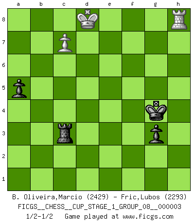 Last move : 1/2-1/2 2020 May 6 20:6:54 [Event "FICGS__CHESS__CUP_STAGE_1_GROUP_08__000003"] [Site "FICGS"] [Date "2019.11.02"] [Round "1"] [White "B. Oliveira,Marcio"] [Black "Fric,Lubos"] [Result "1/2-1/2"] [WhiteElo "2429"] [BlackElo "2293"] 1.e4 e5 2.Nf3 Nc6 3.Bb5 Nf6 4.O-O Nxe4 5.d4 Nd6 6.Bxc6 dxc6 7.dxe5 Nf5 8.Qxd8+ Kxd8 9.Rd1+ Ke8 10.b3 Be7 11.Nc3 Nh4 12.Nxh4 Bxh4 13.Ne2 Be7 14.Nd4 h5 15.Bb2 a6 16.c4 Rg8 17.Rd2 g5 18.Rad1 g4 19.Ne2 h4 20.Nf4 Bf5 21.Nh5 Kf8 22.Nf6 Rg6 23.g3 Kg7 24.gxh4 Rh6 25.f3 gxf3 26.Kf2 Rxh4 27.Rg1+ Bg6 28.Kxf3 Rah8 29.Rd7 Bc5 30.Rg3 Rxh2 31.Ne4 Rxb2 32.Nxc5 R8h2 33.Ne6+ Kh6 34.Nf4 Rbf2+ 35.Ke3 Rc2 36.Nxg6 fxg6 37.Ke4 Rxa2 38.Rxc7 Rae2+ 39.Kd4 Rh4+ 40.Kc5 Rxe5+ 41.Kb6 Rhe4 42.Rxb7 Re3 43.Rxe3 Rxe3 44.Kxc6 g5 45.c5 g4 46.Kd5 g3 47.Rb4 Kg5 48.Rb8 Rd3+ 49.Ke5 Rc3 50.Rg8+ Kh4 51.Kd6 Rxb3 52.c6 Rd3+ 53.Ke7 Rc3 54.Kd7 Rd3+ 55.Kc8 Rc3 56.Rh8+ Kg4 57.c7 a5 58.Kd8 1/2-1/2 Ruy Lopez : Berlin defense, Open variation Kingside Castling by player White (move 4) 10 pieces endgame at move 43 : White KRRPP , Black KRPPP WHITE : King + 2 Rooks 2 Pawns BLACK : King + 1 Rook 3 Pawns 9 pieces endgame at move 43 : White KRPP , Black KRPPP WHITE : King + 1 Rook 2 Pawns BLACK : King + 1 Rook 3 Pawns 8 pieces endgame at move 44 : White KRPP , Black KRPP WHITE : King + 1 Rook 2 Pawns BLACK : King + 1 Rook 2 Pawns 7 pieces endgame at move 51 : White KRP , Black KRPP WHITE : King + 1 Rook 1 Pawn BLACK : King + 1 Rook 2 Pawns This chess game ended in a draw. Follow this game move after move (download)Spassky will not be psyched out by Fischer. (Mike Goodall) Computer sind die einzigen Gegner, die nicht immer eine Ausrede auf Lager haben, wenn sie gegen mich verlieren. (Robert James Fischer) El Ajedrez es imaginación. (David Bronstein) J'ai toujours senti une vague pitié pour l'homme qui ne connaît rien aux échecs, tout comme j'en aurais pour un homme ignorant de l'amour. Les Echecs, comme la musique ou comme l'amour, ont le pouvoir de rendre heureux. (Siegbert Tarrasch) As the days dwindle down... to a precious few. (Maxwell Anderson)