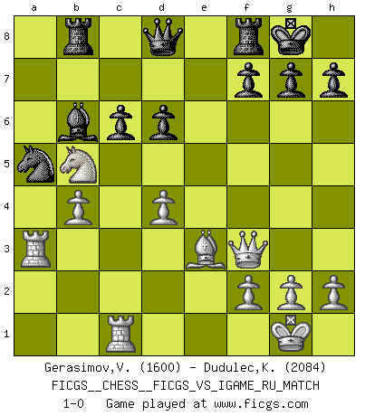 Last move : 1-0 2007 November 1 11:42:54 [Event "FICGS__CHESS__FICGS_VS_IGAME_RU_MATCH"] [Site "FICGS"] [Date "2007.06.27"] [Round "2"] [White "Gerasimov,Vladimir"] [Black "Dudulec,Konstantin"] [Result "1-0"] [WhiteElo "1600"] [BlackElo "2084"] 1.e4 e5 2.Nf3 Nc6 3.Bb5 a6 4.Ba4 Nf6 5.O-O Bc5 6.c3 b5 7.Bb3 d6 8.a4 Rb8 9.d4 Bb6 10.Na3 Bg4 11.axb5 axb5 12.Nxb5 O-O 13.Be3 exd4 14.cxd4 Nxe4 15.Qc2 Na5 16.Qxe4 Bxf3 17.Qxf3 Nxb3 18.Ra3 Na5 19.Rc1 c6 20.b4 1-0 Ruy Lopez : Moeller defense Kingside Castling by player White (move 5) Kingside Castling by player Black (move 12) Player White won this chess game. Follow this game move after move (download)Weak points or holes in the opponent's position must be occupied by pieces not Pawns. (Siegbert Tarrasch) Ein Schachspiel besteht aus drei Phasen: Die erste, wenn du hofftst den Vorteil zu haben, die zweite, wenn du glaubst einen Vorteil zu haben, und die dritte.... wenn du weißt Du wirst verlieren. (Savielly Grigorievitsch Tartakower) En el Ajedrez, tal como en la vida, las bendiciones de hoy pueden ser el veneno del mañana. (Assaic) Mais n'est-ce pas déjà le limiter injurieusement que d'appeler les échecs un jeu? N'est-ce pas aussi une science, un art, ou quelque chose qui, comme le cercueil de Mahomet entre ciel et terre, est suspendu entre l'un et l'autre, et qui réunit un nombre incroyable de contraires ? (Stefan Zweig) Methinks King Thibault should dub Marius Zubac a knight of the square board... I mean table, henceforth addressing him as Sir Marius, and bestow on him a suitable land from the kingdom of FICGS & marry him off to a worthy, fair maiden, lest he slice our heads with his mighty sword in his wrath. (Dinesh De Silva)