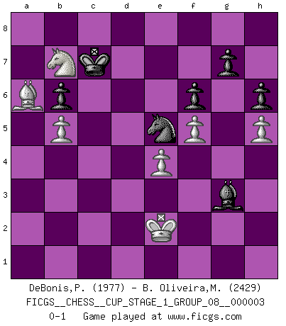 Last move : 0-1 2020 April 30 10:13:36 [Event "FICGS__CHESS__CUP_STAGE_1_GROUP_08__000003"] [Site "FICGS"] [Date "2019.11.02"] [Round "1"] [White "DeBonis,Patrick"] [Black "B. Oliveira,Marcio"] [Result "0-1"] [WhiteElo "1977"] [BlackElo "2429"] 1.d4 Nf6 2.c4 e6 3.Nf3 d5 4.Nc3 Be7 5.Bf4 O-O 6.e3 c5 7.dxc5 Nc6 8.Bd3 dxc4 9.Bxc4 Qxd1+ 10.Rxd1 Bxc5 11.O-O b6 12.Nb5 Ba6 13.a3 Rfc8 14.Bd3 h6 15.h3 Rd8 16.Bc4 Bb7 17.Nc7 Rxd1 18.Rxd1 Rd8 19.Rxd8+ Nxd8 20.Bd3 Be7 21.Nd2 Kf8 22.Nb5 Nc6 23.g4 a6 24.Nd6 e5 25.Nxb7 exf4 26.exf4 Ke8 27.Bxa6 Kd7 28.b4 Kc7 29.b5 Nb8 30.Nc4 Nd5 31.Ne3 Nxe3 32.fxe3 Bxa3 33.e4 Bc1 34.f5 f6 35.Kf2 Nd7 36.Ke1 Bf4 37.Ke2 Ne5 38.Kf1 Nf3 39.Kf2 Ng5 40.Kg2 Bd2 41.h4 Nf7 42.Kf2 Ne5 43.Kg3 Be1+ 44.Kh3 Kd7 45.h5 Kc7 46.Kg2 Nxg4 47.Kf3 Ne5+ 48.Ke2 Bg3 0-1 Queen's pawn game Kingside Castling by player Black (move 5) Kingside Castling by player White (move 11) Player Black won this chess game. Follow this game move after move (download)As one by one I mowed them down, my superiority soon became apparent. (Jose Capablanca) Wenn ein Kopf und ein Buch zusammenstoßen und es klingt hohl, ist es denn allemal im Buche? (Georg Christoph Lichtenberg) Tu eres para mi la Reina en d8 y yo soy el Peón en d7!!. (GM Eduard Gufeld) Toutes choses étant égales, c'est la conviction qui gagne. Alliée à une volonté de vaincre, elle sert de détonateur, suscite des idées, disperse les doutes et aide à penser clairement. (Robert Fischer) I think your argument is specious - I think your tie is ugly. (Gregory House to Dr. Foreman, House M.D.)