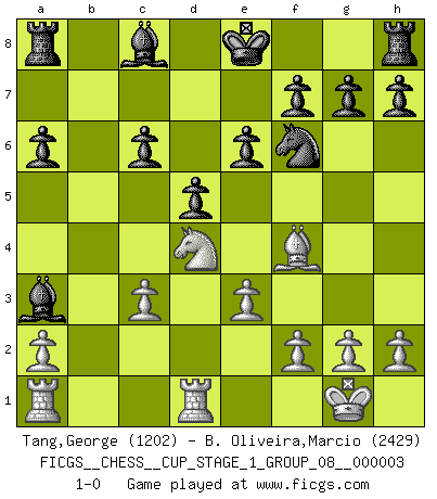Last move : 1-0 2020 January 16 23:48:29 [Event "FICGS__CHESS__CUP_STAGE_1_GROUP_08__000003"] [Site "FICGS"] [Date "2019.11.02"] [Round "1"] [White "Tang,George"] [Black "B. Oliveira,Marcio"] [Result "1-0"] [WhiteElo "1202"] [BlackElo "2429"] 1.d4 Nf6 2.Nf3 d5 3.Bf4 e6 4.e3 c5 5.c3 Nc6 6.Bb5 Qb6 7.Na3 cxd4 8.Nxd4 a6 9.Bxc6+ bxc6 10.O-O Qxb2 11.Qc1 Qxc1 12.Rfxc1 Bxa3 13.Rd1 1-0 Queen's pawn game Kingside Castling by player White (move 10) Player White won this chess game. Follow this game move after move (download)Chess is the art which expresses the science of logic. (Mikhail Botvinnik) Wer sich die Fähigkeit anerziehen will im Schach selbstständig zu denken, der muß alles meiden, was leblos ist: ausgeklügelte Theorien, die sich auf sehr wenige Beispiele und eine Menge Hirngespinste stützen. (Emanuel Lasker) Por esta medida (el intervalo entre Fischer y sus contemporaneos), yo le considero el mas grande campeón mundial. (Garry Kasparov) L'action d'une oeuvre littéraire se déroule sur un champ de bataille. Les masques et les types du drame moderne correspondent aux pièces du jeu d'échecs. L'intrigue correspond aux coups et aux gambits, c'est à dire aux techniques du jeu telles qu'utilisées et interprétées par les joueurs. Les tactiques et les péripéties [mouvements] correspondent aux coups exécutés par l'adversaire. (Viktor Shklovsky) Imagination is more important than knowledge. Knowledge is limited. Imagination encircles the world. (Albert Einstein)