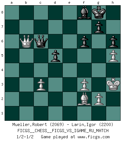 Last move : 1/2-1/2 2007 December 23 10:17:49 [Event "FICGS__CHESS__FICGS_VS_IGAME_RU_MATCH"] [Site "FICGS"] [Date "2007.06.27"] [Round "1"] [White "Mueller,Robert"] [Black "Larin,Igor"] [Result "1/2-1/2"] [WhiteElo "2069"] [BlackElo "2200"] 1.e4 e5 2.Nf3 d6 3.d4 exd4 4.Nxd4 Nf6 5.Nc3 Be7 6.Bf4 O-O 7.Be2 Re8 8.O-O Bf8 9.Qd2 Nxe4 10.Nxe4 Rxe4 11.Bf3 Re8 12.Rfe1 h6 13.Rxe8 Qxe8 14.Re1 Qd8 15.Qa5 Qf6 16.Qd2 a6 17.h3 Be7 18.Bg3 Nd7 19.Re3 Nc5 20.c3 Ne6 21.Qc2 Bf8 22.Nxe6 Bxe6 23.Bxb7 Rb8 24.Bxa6 Bxa2 25.Qe2 Bb3 26.Bc4 Bxc4 27.Qxc4 c5 28.Qa4 Qf5 29.Re8 Rxe8 30.Qxe8 Qd3 31.Kh2 Qd2 32.h4 c4 33.Qb5 Qd3 34.f3 Qd2 35.h5 Qc2 36.Qxc4 Qxb2 37.Qc6 d5 38.Qa8 Qa3 39.Qd8 Qc5 40.Kh3 Qc6 41.Bf2 f6 42.Qb6 1/2-1/2 Philidor : Exchange variation Kingside Castling by player Black (move 6) Kingside Castling by player White (move 8) This chess game ended in a draw. Follow this game move after move (download)I won't play with you anymore. You have insulted my friend. - When an opponent cursed himself for a blunder. (Miguel Najdorf) Warum muß ich gegen diesen IDIOTEN verlieren? (Aaron Nimzowitsch) La vida es como el Ajedrez, con lucha, competición y eventos buenos y malos. (Benjamin Franklin) Vous m'avez demandé de vous exposer quel est le fondement de la prière. Je ne fais que préparer les pièces du jeu sur la table... Nous sera-t-il permis d'en adopter les règles et si nous les appliquons scrupuleusement nous ne tarderons pas à faire mat le Roi divin ! Il ne pourra échapper à nos mains. (Sainte Thérèse d'Avila, Chemin de perfection) CHESS, n. f. [echecs, Fr.] A nice and abstruse game, in which two sets of puppets are moved in opposition to each other. (Dr Samuel Johnson, A Dictionary Of The English Language, 1755)