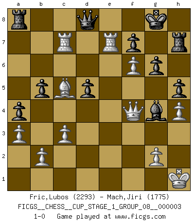 Last move : 1-0 2020 May 8 23:22:52 [Event "FICGS__CHESS__CUP_STAGE_1_GROUP_08__000003"] [Site "FICGS"] [Date "2019.11.02"] [Round "1"] [White "Fric,Lubos"] [Black "Mach,Jiri"] [Result "1-0"] [WhiteElo "2293"] [BlackElo "1775"] 1.e4 e6 2.d4 d5 3.Nc3 Nf6 4.e5 Nfd7 5.f4 c5 6.Nf3 Nc6 7.Be3 a6 8.Be2 Be7 9.O-O O-O 10.a3 b5 11.Qd2 Qb6 12.Nd1 a5 13.c3 a4 14.Bd3 Na5 15.Qe2 Nb3 16.dxc5 Ndxc5 17.Rb1 Ba6 18.Nf2 Qc6 19.Rfd1 g6 20.Kh1 Nxd3 21.Nxd3 Rfd8 22.Nd4 Nxd4 23.Bxd4 h6 24.Qe3 Kh7 25.Nf2 Kg7 26.Ng4 Rh8 27.Nf6 h5 28.h4 Kf8 29.Re1 Bc8 30.Rbd1 Bd8 31.Rd2 Bc7 32.Rd3 Bd8 33.Qg3 Bxf6 34.exf6 Bd7 35.f5 exf5 36.Re7 f4 37.Qxf4 Rh7 38.Bc5 Kg8 39.Rg3 Bg4 40.Rc7 Qe8 41.Re3 Qd8 42.R3e7 1-0 French : Steinitz, Boleslavsky variation Kingside Castling by player White (move 9) Kingside Castling by player Black (move 9) Player White won this chess game. Follow this game move after move (download)By playing at Chess then, we may learn: First: Foresight... Second: Circumspection... Third: Caution... And lastly, we learn by Chess the habit of not being discouraged by present bad appearances in the state of our affairs, the habit of hoping for a favorable chance, and that of persevering in the secrets of resources. (Benjamin Franklin) Moralische Siege zählen nicht. (Savielly Grigorievitsch Tartakower) Cuando me preguntan: -¿Cual es el secreto que te hace hacer mejores movidas que tus oponentes?, Yo respondo: Me da gusto que me pregunten eso, porque, como veran, hay una simple razón. Yo pienso mis propias movidas y dejo a mi oponente que el piense las suyas. (Alexander Alekhine) Nous vivons dans un monde échiquéen : chaque jour qui passe est un défi à relever. (Philosophe Sasha) I teach you to lie, cheat and steal, and as soon as my back's turned you wait in line ? (Gregory House, House M.D.)