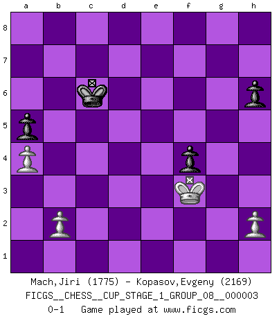 Last move : 0-1 2020 April 19 1:14:24 [Event "FICGS__CHESS__CUP_STAGE_1_GROUP_08__000003"] [Site "FICGS"] [Date "2019.11.02"] [Round "1"] [White "Mach,Jiri"] [Black "Kopasov,Evgeny"] [Result "0-1"] [WhiteElo "1775"] [BlackElo "2169"] 1.d4 d5 2.c4 c6 3.Nf3 Nf6 4.Nc3 e6 5.e3 Nbd7 6.Bd3 dxc4 7.Bxc4 b5 8.Bd3 a6 9.e4 c5 10.d5 Qc7 11.O-O Bb7 12.dxe6 fxe6 13.Bc2 Bd6 14.Ng5 Nf8 15.f4 h6 16.e5 O-O-O 17.Nf7 Qxf7 18.exd6 Qd7 19.Re1 Rg8 20.a4 b4 21.Ne4 Nxe4 22.Bxe4 Qxd6 23.Bxb7+ Kxb7 24.Be3 Qxd1 25.Rexd1 Ng6 26.Bxc5 Nxf4 27.Bxb4 e5 28.Bd6 Rge8 29.Kf2 Rd7 30.g3 Red8 31.gxf4 exf4 32.Rg1 Rxd6 33.Rxg7+ R8d7 34.Rxd7+ Rxd7 35.Re1 Rd2+ 36.Re2 Rxe2+ 37.Kxe2 a5 38.Kf3 Kc6 0-1 QGD Slav : 4.Nc3 Kingside Castling by player White (move 11) Queenside Castling by player Black (move 16) 10 pieces endgame at move 34 : White KRPPP , Black KRPPP WHITE : King + 1 Rook 3 Pawns BLACK : King + 1 Rook 3 Pawns 9 pieces endgame at move 36 : White KPPP , Black KRPPP WHITE : King + 3 Pawns BLACK : King + 1 Rook 3 Pawns 8 pieces endgame at move 37 : White KPPP , Black KPPP WHITE : King + 3 Pawns BLACK : King + 3 Pawns Player Black won this chess game. Follow this game move after move (download)A sacrifice is best refuted by accepting it. (Wilhelm Steinitz) Wenn Dein Gegner dir ein Remis anbietet, versuch herauszufinden, weshalb er glaubt schlechter zu stehen. (Nigel Short) Los errores estan ahí, esperando a que se cometan. (Savielly Tartakower) Dans le domaine de la peinture, de la gravure et de la sculpture, dès la première décennie de notre siècle, les artistes abandonnent la représentation de la partie d'échecs pour se concentrer sur les pièces, sur les échiquiers et sur toutes les variations auxquelles les unes et les autres peuvent donner lieu. On passe en quelque sorte d'un thème social à un thème musical (au sens de la musica médiévale, c'est-à-dire d'une notion qui inclue le rythme, l'harmonie, la construction et la déconstruction, etc.). Graphiquement et picturalement, l'échiquier apparaît comme une structure ouverte, dynamique, d'une richesse infinie, autorisant toutes les combinatoires et débouchant sur des mouvements et des rythmes de nature exponentielle. (Michel Pastoureau) Mandala - that's it! 16x16 squares as multiple of the four and the eight because of the Four Noble Truths and the Noble Eightfold Path. (Heinz-Georg Lehnhoff about Big Chess)