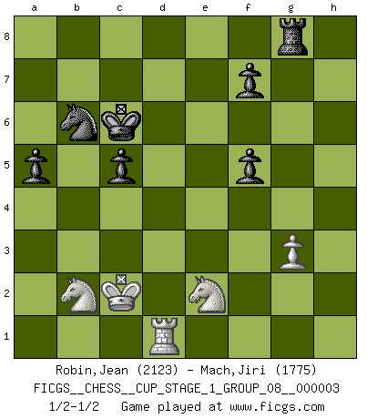 Last move : 1/2-1/2 2020 May 3 11:21:43 [Event "FICGS__CHESS__CUP_STAGE_1_GROUP_08__000003"] [Site "FICGS"] [Date "2019.11.02"] [Round "1"] [White "Robin,Jean"] [Black "Mach,Jiri"] [Result "1/2-1/2"] [WhiteElo "2123"] [BlackElo "1775"] 1.e4 e5 2.Nf3 Nc6 3.Bb5 a6 4.Ba4 Nf6 5.O-O Be7 6.Re1 b5 7.Bb3 O-O 8.a4 b4 9.a5 d6 10.c3 Rb8 11.Bc4 Nxe4 12.Bd5 Nxf2 13.Kxf2 Nxa5 14.cxb4 c6 15.Ba2 Rxb4 16.d4 exd4 17.Kg1 d5 18.Na3 Rb7 19.Qxd4 Bf6 20.Qc5 Qb6 21.Qxb6 Rxb6 22.Bd2 Nb7 23.Bc3 Rxb2 24.Bxf6 gxf6 25.Reb1 Rxb1+ 26.Rxb1 Nc5 27.Rc1 Nd3 28.Rc3 Nb4 29.Bb3 a5 30.Nd4 Bd7 31.Ba4 Rc8 32.Nb1 Rc7 33.g3 Kf8 34.Nd2 Ke7 35.N2b3 h5 36.Kf1 Kd6 37.Ke2 Ra7 38.Kd2 Ra8 39.Nc5 Bc8 40.Ndb3 f5 41.Rc1 Be6 42.Nb7+ Ke5 43.Re1+ Kf6 44.N7c5 h4 45.Nd4 hxg3 46.hxg3 Re8 47.Re3 Re7 48.Bd1 Bc8 49.Ra3 Ra7 50.Ra4 Ra8 51.Ke3 Ke5 52.Ndb3 d4+ 53.Nxd4 Nd5+ 54.Kd2 Nb6 55.Nd3+ Kd6 56.Ra1 Bd7 57.Bh5 c5 58.Ne2 Be6 59.Bf3 Bd5 60.Bxd5 Kxd5 61.Kc2 Kd6 62.Rd1 Re8 63.Nb2 Kc6 64.Nc3 Rg8 65.Ne2 1/2-1/2 Ruy Lopez : Closed, 7...O-O Kingside Castling by player White (move 5) Kingside Castling by player Black (move 7) This chess game ended in a draw. Follow this game move after move (download)Of Chess it has been said that life is not long enough for it, but that is the fault of life, not Chess. (William Ewart Napier) Wenn du gegen Bobby spielst, ist es keine Frage von gewinnen oder verlieren. Es ist eine Frage des Überlebens. (Boris Vassilievich Spassky) Morphy probablemente fue el genio más grande de todos. (Bobby Fischer) Votre prénom est 'Tactique', votre deuxième prénom est 'Tactique' et votre nom est 'Tactique'. (Ken Smith) That's absurd. I love it. (Gregory House, House M.D.)