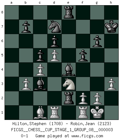 Last move : 0-1 2019 November 24 18:7:3 [Event "FICGS__CHESS__CUP_STAGE_1_GROUP_08__000003"] [Site "FICGS"] [Date "2019.11.02"] [Round "1"] [White "Hilton,Stephen"] [Black "Robin,Jean"] [Result "0-1"] [WhiteElo "1708"] [BlackElo "2123"] 1.d4 Nf6 2.c4 g6 3.Nc3 Bg7 4.e4 d6 5.Be2 O-O 6.Bg5 c5 7.d5 h6 8.Be3 e6 9.h3 exd5 10.exd5 Re8 11.Nf3 Bf5 12.O-O Ne4 13.Nxe4 Bxe4 14.Qd2 Kh7 15.Rfe1 Nd7 16.Rad1 Qf6 17.b3 a5 18.Nh2 a4 19.Ng4 Qc3 20.Bxh6 Qxd2 21.Bxd2 f5 22.Ne3 axb3 23.axb3 Ra2 24.Bc1 Bc3 25.Rf1 Rxe2 0-1 King's Indian : Averbakh, 6...c5 Kingside Castling by player Black (move 5) Kingside Castling by player White (move 12) Player Black won this chess game. Follow this game move after move (download)The game of Chess is not merely an idle amusement; several very valuable qualities of the mind are to be acquired and strengthened by it, so as to become habits ready on all occasions; for life is a kind of Chess. (Benjamin Franklin) Die Neutralität betrachte ich als eine schwere Krankheit. (Viktor Kortschnoi) Aquel que teme a un Peón de Reina aislado, debería de retirarse del Ajedrez. (Siegbert Tarrasch) Il n'y a plus de joueurs du niveau de Jacob Murray dont la seule quête est le beau jeu, le plaisir de voir les pièces construire quelque chose. Sur 10 idées à la minute, 9 seront sans intérêt, la dernière s'avèrera géniale. (Christian Bauer) Nobody is always a winner, and anybody who says he is, is either a liar or doesn't play poker. (Amarillo Slim)