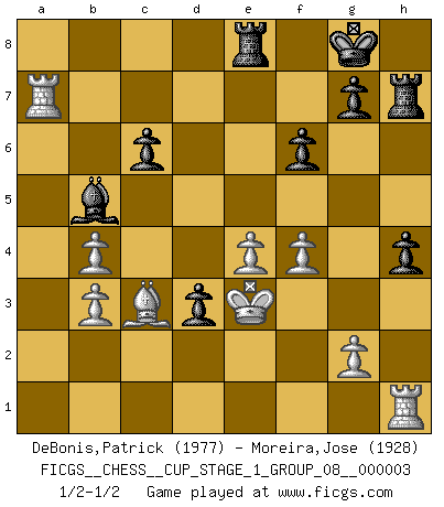 Last move : 1/2-1/2 2019 December 30 16:38:42 [Event "FICGS__CHESS__CUP_STAGE_1_GROUP_08__000003"] [Site "FICGS"] [Date "2019.11.02"] [Round "1"] [White "DeBonis,Patrick"] [Black "Moreira,Jose"] [Result "1/2-1/2"] [WhiteElo "1977"] [BlackElo "1928"] 1.d4 Nf6 2.c4 e6 3.Nf3 d5 4.Nc3 c6 5.e3 Bd6 6.Bd3 dxc4 7.Bxc4 b5 8.Bd3 Nbd7 9.O-O O-O 10.b3 Bb7 11.Bb2 b4 12.Ne4 Nxe4 13.Bxe4 Rc8 14.Nd2 Ba6 15.Re1 Nf6 16.a3 Nxe4 17.Nxe4 Bxh2+ 18.Kxh2 Qh4+ 19.Kg1 Qxe4 20.axb4 Bb5 21.Rxa7 Rcd8 22.f3 Qh4 23.e4 e5 24.Qd2 Rd6 25.Qf2 Qxf2+ 26.Kxf2 exd4 27.Rd1 d3 28.Ke3 h5 29.Bd4 Rfd8 30.Bc5 Re6 31.Bb6 Rde8 32.Bd4 h4 33.Rg1 Rd8 34.Rh1 Red6 35.Bc5 Rh6 36.Kd2 f6 37.Be3 Rh7 38.Bb6 Rf8 39.Bc5 Rd8 40.Rha1 Rh6 41.Be3 Rh7 42.Rh1 Rc8 43.Bd4 Rd8 44.Bc3 Rb8 45.f4 Re8 46.Ke3 1/2-1/2 Queen's pawn game Kingside Castling by player White (move 9) Kingside Castling by player Black (move 9) This chess game ended in a draw. Follow this game move after move (download)Who is your opponent tonight, tonight I am playing against the Black pieces. (Akiba Rubinstein) Fallen sollten polizeilich verboten werden. (Savielly Grigorievitsch Tartakower) Los finales de Peón son del Ajedrez lo que el cesped es del Golf. (Cecil Purdy) Je menace de comprendre la position. (Anonyme) Do you know these so called Volunteers don't even get paid! (Simpsons)
