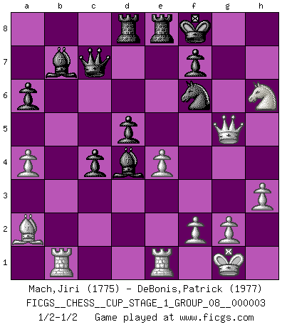 Last move : 1/2-1/2 2020 April 7 22:48:0 [Event "FICGS__CHESS__CUP_STAGE_1_GROUP_08__000003"] [Site "FICGS"] [Date "2019.11.02"] [Round "1"] [White "Mach,Jiri"] [Black "DeBonis,Patrick"] [Result "1/2-1/2"] [WhiteElo "1775"] [BlackElo "1977"] 1.e4 e5 2.Nf3 Nc6 3.Bb5 a6 4.Ba4 Nf6 5.O-O b5 6.Bb3 Bb7 7.d3 Be7 8.Re1 O-O 9.h3 d6 10.a3 Nb8 11.Nbd2 c5 12.Nf1 Qc7 13.Ne3 c4 14.Ba2 Nbd7 15.Nf5 Rfe8 16.Bg5 h6 17.Bxh6 gxh6 18.Nxh6+ Kg7 19.Nf5+ Kg8 20.Qd2 Nh7 21.b3 d5 22.bxc4 bxc4 23.Rab1 Rac8 24.Nh6+ Kf8 25.a4 Bc5 26.Ng5 Ndf6 27.c3 Rcd8 28.d4 exd4 29.cxd4 Nxg5 30.Qxg5 Bxd4 1/2-1/2 Ruy Lopez : Archangelsk (counterthrust) variation Kingside Castling by player White (move 5) Kingside Castling by player Black (move 8) This chess game ended in a draw. Follow this game move after move (download)I thought the most common mistake [in chess] was the first one: Learning the game :P (Garvin Gray, FICGS forum) Wie, soll nun auch die Opposition abgeschafft werden? Ja, es tut mir leid, Ihnen diesen Schmerz nicht ersparen zu können. (Aaron Nimzowitsch) El ganador de una partida es aquel jugador que hace el penúltimo error. (Savielly Tartakover) L'action d'une oeuvre littéraire se déroule sur un champ de bataille. Les masques et les types du drame moderne correspondent aux pièces du jeu d'échecs. L'intrigue correspond aux coups et aux gambits, c'est à dire aux techniques du jeu telles qu'utilisées et interprétées par les joueurs. Les tactiques et les péripéties [mouvements] correspondent aux coups exécutés par l'adversaire. (Viktor Shklovsky) An expert is a man who has made all the mistakes which can be made in a very narrow field. (Niels Bohr)