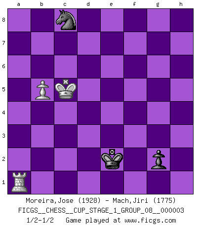 Last move : 1/2-1/2 2020 April 2 13:55:30 [Event "FICGS__CHESS__CUP_STAGE_1_GROUP_08__000003"] [Site "FICGS"] [Date "2019.11.02"] [Round "1"] [White "Moreira,Jose"] [Black "Mach,Jiri"] [Result "1/2-1/2"] [WhiteElo "1928"] [BlackElo "1775"] 1.e4 c5 2.Nf3 d6 3.d4 cxd4 4.Nxd4 Nf6 5.Nc3 a6 6.Be3 e5 7.Nb3 Be6 8.f3 Be7 9.Qd2 Nbd7 10.g4 O-O 11.g5 Nh5 12.O-O-O Qc7 13.f4 exf4 14.Bxf4 Nxf4 15.Qxf4 Rac8 16.h4 b5 17.Rh2 Ne5 18.Kb1 f6 19.g6 Nxg6 20.Qd2 Qd7 21.Nd4 Bg4 22.Be2 f5 23.Nd5 Rc5 24.Nb3 Rc6 25.Nd4 Rc5 26.Nb3 Rc6 27.h5 Ne5 28.Nd4 Rc5 29.Nb3 Rc6 30.exf5 Bxf5 31.Nd4 Rc5 32.Nxe7+ Qxe7 33.Nxf5 Rxf5 34.Qxd6 Qxd6 35.Rxd6 Rf6 36.Rd8+ Rf8 37.Rd1 Nc4 38.Rd7 Rf7 39.Rd8+ Rf8 40.Rd7 Rf7 41.Rd4 R7f5 42.a4 Rfd5 43.Rxd5 Rxd5 44.Bd3 Ne5 45.Bf5 Rd6 46.Re2 Nc6 47.Re4 g6 48.hxg6 hxg6 49.Bc8 bxa4 50.Bxa6 Kf7 51.Rxa4 g5 52.Bb5 Rd1+ 53.Ka2 Ne5 54.Ba6 g4 55.Bb7 Rd2 56.Kb3 g3 57.Rf4+ Ke6 58.Rf1 Rd8 59.Bg2 Rb8+ 60.Ka2 Rd8 61.Rg1 Kf5 62.b4 Kg4 63.b5 Rc8 64.Kb3 Rc5 65.c4 Nxc4 66.Kb4 Rc8 67.Rh1 Nd6 68.Bh3+ Kf3 69.Bxc8 Nxc8 70.Rf1+ Ke2 71.Ra1 g2 72.Kc5 1/2-1/2 Sicilian : Najdorf, Byrne (English) attack Kingside Castling by player Black (move 10) Queenside Castling by player White (move 12) 10 pieces endgame at move 50 : White KRBPP , Black KRNPP WHITE : King + 1 Rook 1 Bishop 2 Pawns BLACK : King + 1 Rook 1 Knight 2 Pawns 9 pieces endgame at move 51 : White KRBPP , Black KRNP WHITE : King + 1 Rook 1 Bishop 2 Pawns BLACK : King + 1 Rook 1 Knight 1 Pawn 8 pieces endgame at move 65 : White KRBP , Black KRNP WHITE : King + 1 Rook 1 Bishop 1 Pawn BLACK : King + 1 Rook 1 Knight 1 Pawn 7 pieces endgame at move 69 : White KRBP , Black KNP WHITE : King + 1 Rook 1 Bishop 1 Pawn BLACK : King + 1 Knight 1 Pawn 6 pieces endgame at move 69 : White KRP , Black KNP WHITE : King + 1 Rook 1 Pawn BLACK : King + 1 Knight 1 Pawn This chess game ended in a draw. Follow this game move after move (download)A man that will take back a move at Chess will pick a pocket. (Richard Fenton) Heutzutage gewinnt im Turnier nicht derjenige Spieler, der weitreichende Pläne entwirft, sondern einfach jener, der Zug um Zug kämpft. (David Bronstein) Si no le temes a Spassky, entonces elimino el elemento del dinero. (Jim Slater) Vous m'avez demandé de vous exposer quel est le fondement de la prière. Je ne fais que préparer les pièces du jeu sur la table... Nous sera-t-il permis d'en adopter les règles et si nous les appliquons scrupuleusement nous ne tarderons pas à faire mat le Roi divin ! Il ne pourra échapper à nos mains. (Sainte Thérèse d'Avila, Chemin de perfection) Success without honor is an unseasoned dish; it will satisfy your hunger, but it won't taste good. (Joe Paterno)