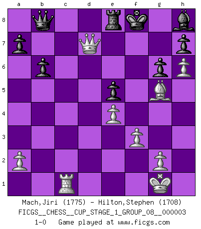Last move : 1-0 2020 January 7 19:2:16 [Event "FICGS__CHESS__CUP_STAGE_1_GROUP_08__000003"] [Site "FICGS"] [Date "2019.11.02"] [Round "1"] [White "Mach,Jiri"] [Black "Hilton,Stephen"] [Result "1-0"] [WhiteElo "1775"] [BlackElo "1708"] 1.c4 g6 2.d4 Nf6 3.Nc3 d5 4.cxd5 Nxd5 5.e4 Nxc3 6.bxc3 Bg7 7.Bc4 O-O 8.Ne2 c5 9.O-O Nc6 10.Be3 Bg4 11.f3 Bd7 12.Rb1 cxd4 13.cxd4 Rb8 14.Qd2 Na5 15.Bd3 b6 16.Rfc1 Rc8 17.Bg5 Re8 18.h4 f6 19.Be3 e5 20.dxe5 fxe5 21.Nc3 Nc4 22.Bxc4+ Rxc4 23.Nd5 Rxc1+ 24.Rxc1 Be6 25.Bg5 Qb8 26.h5 Bxd5 27.Qxd5+ Kf8 28.h6 Bh8 29.Qd7 1-0 English Opening Kingside Castling by player Black (move 7) Kingside Castling by player White (move 9) Player White won this chess game. Follow this game move after move (download)Chess is a part of culture and if a culture is declining then Chess too will decline. (Mikhail Botvinnik) Bis jetzt ist Weiß einer wohlbekannten Analyse gefolgt. Aber jetzt begeht er einen schrecklichen Fehler: Er beginnt seinen eigenen Kopf zu benutzen. (Siegbert Tarrasch) Al jugar al Ajedrez entonces, podemos aprender: Primero: Previsión... Segundo: Prudencia... Tercero: Cautela... Y al final, aprendemos del Ajedrez el hábito de no ser desanimados por apariencias malas presentes en el estado de nuestros asuntos, el hábito de la esperanza por una oportunidad favorable y la perseveración de los secretos de los recursos. (Benjamin Franklin) Pour se monter efficace, un Cavalier a besoin d'avant-postes ! Les Cavaliers font les meilleurs bloqueurs de pions passés. Once you start thinking you have nothing left to learn, you have everything to learn. (Steve Badget)
