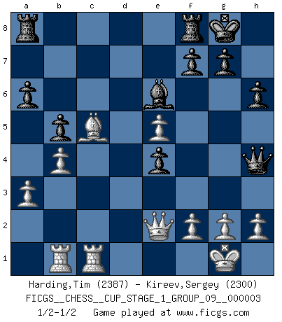 Last move : 1/2-1/2 2019 November 25 15:17:56 [Event "FICGS__CHESS__CUP_STAGE_1_GROUP_09__000003"] [Site "FICGS"] [Date "2019.11.02"] [Round "1"] [White "Harding,Tim"] [Black "Kireev,Sergey"] [Result "1/2-1/2"] [WhiteElo "2387"] [BlackElo "2300"] 1.c4 e5 2.Nc3 Nf6 3.Nf3 Nc6 4.e4 Bb4 5.d3 d6 6.a3 Bc5 7.b4 Bb6 8.Na4 Bd4 9.Rb1 a6 10.Nxd4 Nxd4 11.Nc3 b5 12.Be2 O-O 13.O-O c6 14.Be3 Be6 15.Qd2 h6 16.Rfc1 Nxe2+ 17.Qxe2 d5 18.cxd5 cxd5 19.d4 Nxe4 20.Nxe4 dxe4 21.dxe5 Qh4 22.Bc5 1/2-1/2 English Opening Kingside Castling by player Black (move 12) Kingside Castling by player White (move 13) This chess game ended in a draw. Follow this game move after move (download)Chess is above all, a fight ! (Emanuel Lasker) Dieses schreckliche Gefühl, dass ich gegen eine Maschine spielte, die niemals Fehler macht, zerschmetterte meinen Widerstand. (Mark Taimanov) Yo considero que Fischer es uno de los expertos mas grandes de aperturas de siempre. (Keith Hayward) Ne tendez aucun piège pour le plaisir ! Ne jouez rien dans l'espoir que l'adversaire réagisse de façon stupide ! Prenez toujours pour acquis que l'adversaire va trouver le meilleur coup ! Ne jouez jamais de coup dans l'espoir que l'adversaire ne voie pas la menace ! Chacun de vos coups doit améliorer la position d'une façon ou d'une autre. I've never seen so many men wasted so badly. (Blondie in The Good, The Bad and The Ugly)