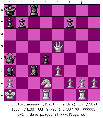 Last move : 0-1 2019 November 25 10:46:49 [Event "FICGS__CHESS__CUP_STAGE_1_GROUP_09__000003"] [Site "FICGS"] [Date "2019.11.02"] [Round "1"] [White "Drobotov,Gennady"] [Black "Harding,Tim"] [Result "0-1"] [WhiteElo "1972"] [BlackElo "2387"] 1.d4 Nf6 2.Bg5 d5 3.e3 c5 4.Nc3 Nc6 5.Bxf6 gxf6 6.dxc5 e6 7.Qh5 Bxc5 8.O-O-O Qe7 9.Kb1 Bd7 10.Nf3 O-O-O 11.Bb5 Kb8 12.Nd4 Rhg8 13.Rhg1 Ne5 14.Bxd7 Rxd7 15.Nf3 Nc4 16.Nd2 Nxb2 17.Kxb2 Ba3+ 18.Ka1 Qb4 19.Na4 Rc8 20.Qxh7 Rdc7 21.c3 Rxc3 22.Qh6 d4 23.Qf4+ e5 24.Qxf6 Qxa4 25.Qxe5+ Ka8 0-1 Trompowsky attack (Ruth, Opovcensky Opening) Queenside Castling by player White (move 8) Queenside Castling by player Black (move 10) Player Black won this chess game. Follow this game move after move (download)Chess books should be used as we use glasses: to assist the sight, although some players make use of them as if they thought they conferred sight. (Jose Raul Capablanca) Gegen einen Schachcomputer zu verlieren ist wie Löcher in den Strümpfen zuhaben. Es ist nicht peinlich, solange man der einzige ist der es weiß. (Anonymous) Diferente gente reacciona diferentemente en aceptar la derrota. (Bobby Fischer) Vouloir jouer aux échecs contre soi-même est aussi paradoxal que vouloir marcher sur son ombre. (Stefan Zweig) Just because you do not take an interest in politics doesn't mean politics won't take an interest in you. (Pericles 430 B.C.)
