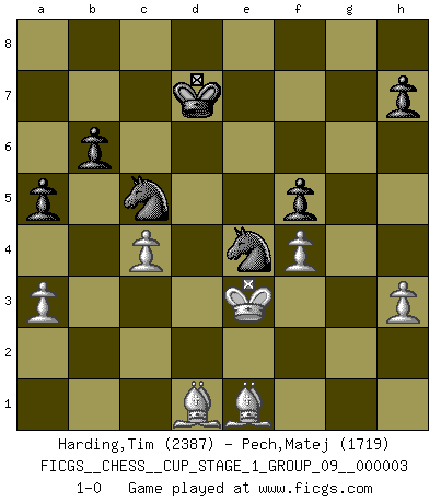 Last move : 1-0 2020 May 16 20:50:14 [Event "FICGS__CHESS__CUP_STAGE_1_GROUP_09__000003"] [Site "FICGS"] [Date "2019.11.02"] [Round "1"] [White "Harding,Tim"] [Black "Pech,Matej"] [Result "1-0"] [WhiteElo "2387"] [BlackElo "1719"] 1.Nf3 Nf6 2.c4 e6 3.Nc3 Bb4 4.Qc2 O-O 5.a3 Bxc3 6.Qxc3 b6 7.g3 Bb7 8.Bg2 d5 9.b4 d4 10.Qb2 e5 11.O-O Nbd7 12.d3 Re8 13.e4 dxe3 14.Bxe3 Qc8 15.Rfe1 c5 16.Bd2 e4 17.dxe4 Rxe4 18.Rxe4 Bxe4 19.Re1 cxb4 20.Bxb4 Qc7 21.Re3 Rc8 22.Bf1 Bxf3 23.Rxf3 Re8 24.Qd4 Re4 25.Qd2 Nc5 26.Re3 Qd7 27.Qxd7 Nfxd7 28.Rxe4 Nxe4 29.f3 Nec5 30.Kf2 f6 31.Ke3 Kf7 32.Kd4 Ke6 33.Be2 f5 34.h3 g6 35.Ke3 g5 36.f4 gxf4+ 37.gxf4 Nf6 38.Bd1 Nfe4 39.Bc2 Kf6 40.Kd4 Ne6+ 41.Ke3 N6c5 42.Be1 Ke6 43.Kd4 Nf6 44.Bh4 Nfe4 45.Be1 Nf6 46.Bb4 Nh5 47.Bd2 Ng3 48.Be1 Nge4 49.Bb4 a5 50.Be1 Kd6 51.Ke3 Kd7 52.Bd1 1-0 Reti Opening Kingside Castling by player Black (move 4) Kingside Castling by player White (move 11) Player White won this chess game. Follow this game move after move (download)A thorough understanding of the typical mating continuations makes the most complicated sacrificial combinations leading up to them not only not difficult, but almost a matter of course. (Siegbert Tarrasch) Karpov ist ein Museumsstück. (Garry Kasparov) Desconfianza es la característica mas necesaria de un jugador de Ajedrez. (Siegbert Tarrasch) Les Echecs, c'est l'art de la guerre sans les charniers, c'est la résurrection des morts tombés au champ d'honneur, l'espoir perpétuel, la suprématie de l'intelligence sur la force, la culture de l'esprit. (F. Szpiner) How many people work in NATO Headquarters ? - About half of them. (Dirk Stikker, NATO general secretary)
