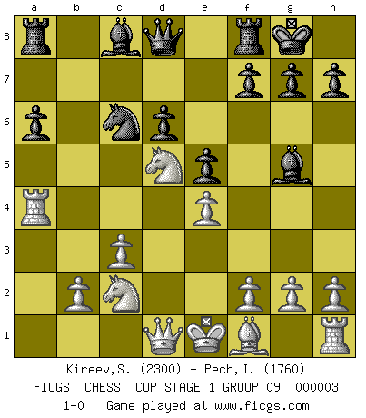 Last move : 1-0 2019 December 18 22:40:11 [Event "FICGS__CHESS__CUP_STAGE_1_GROUP_09__000003"] [Site "FICGS"] [Date "2019.11.02"] [Round "1"] [White "Kireev,Sergey"] [Black "Pech,Jaroslav senior"] [Result "1-0"] [WhiteElo "2300"] [BlackElo "1760"] 1.e4 c5 2.Nf3 Nc6 3.d4 cxd4 4.Nxd4 Nf6 5.Nc3 e5 6.Ndb5 d6 7.Bg5 a6 8.Na3 b5 9.Nd5 Be7 10.Bxf6 Bxf6 11.c3 O-O 12.Nc2 Bg5 13.a4 bxa4 14.Rxa4 1-0 This chess game has been lost on time (started : 2019.11.02 13:52:35) Sicilian : Pelikan (Lasker/Sveshnikov) variation Kingside Castling by player Black (move 11) Player White won this chess game. Follow this game move after move (download)Bobby is the finest Chess player this country ever produced. His memory for the moves, his brilliance in dreaming up combinations, and his fierce determination to win are uncanny. (John Collins) Ein Schachspiel besteht aus drei Phasen: Die erste, wenn du hofftst den Vorteil zu haben, die zweite, wenn du glaubst einen Vorteil zu haben, und die dritte.... wenn du weißt Du wirst verlieren. (Savielly Grigorievitsch Tartakower) El Ajedrez se juega con la mente... ¡no con las manos!. (Renaud y Kahn) Les erreurs sont comme les malheurs, elles n'arrivent jamais seules. (Siegbert Tarrasch) If you have any trouble condescending, find a Unix user to show you how it's done. (Scott Adams)