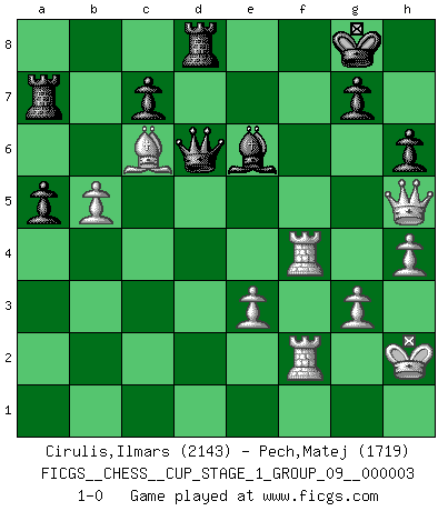 Last move : 1-0 2020 January 30 21:28:46 [Event "FICGS__CHESS__CUP_STAGE_1_GROUP_09__000003"] [Site "FICGS"] [Date "2019.11.02"] [Round "1"] [White "Cirulis,Ilmars"] [Black "Pech,Matej"] [Result "1-0"] [WhiteElo "2143"] [BlackElo "1719"] 1.c4 e5 2.Nc3 Nf6 3.g3 d5 4.cxd5 Nxd5 5.Bg2 Nb6 6.Nf3 Nc6 7.O-O Be7 8.a3 O-O 9.d3 Be6 10.b4 a5 11.b5 Nd4 12.Bb2 Nb3 13.Rb1 f6 14.Nd2 Nc5 15.a4 Qd7 16.Qc2 Bf7 17.h4 f5 18.Ba3 Ncxa4 19.Bxe7 Nxc3 20.Qxc3 Qxe7 21.Bxb7 Ra7 22.Bc6 Be8 23.Nc4 Nxc4 24.Qxc4+ Bf7 25.Qa4 Rd8 26.e3 Qd6 27.Rfd1 Bh5 28.Rd2 f4 29.Kh2 fxg3+ 30.fxg3 Bf7 31.d4 h6 32.Rf2 Be6 33.dxe5 Qxe5 34.Rbf1 Qd6 35.Rf4 Qd3 36.R1f2 Bb3 37.Qa1 Be6 38.Qe5 Qd6 39.Qh5 1-0 English : Bremen, reverse Dragon Kingside Castling by player White (move 7) Kingside Castling by player Black (move 8) Player White won this chess game. Follow this game move after move (download)Checkers is for tramps. (Paul Morphy) Um sich vor der Gefahr einer Erkältung zu schützen, sorge der wanderlustige König beizeiten für ein brauchbares Versteck. (Aaron Nimzowitsch) Peones: ellos son el alma de esta partida, solos forman el ataque y la defensa. (Philidor) Psychologiquement, tu dois avoir confiance en toi même, mais cette confiance doit être basée sur des faits. (Robert Fischer) Thus, what is of supreme importance in war is to attack the enemy's strategy. (Sun Tzu)