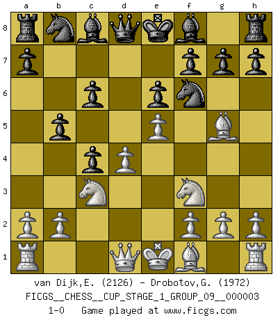 Last move : 1-0 2019 December 21 10:38:16 [Event "FICGS__CHESS__CUP_STAGE_1_GROUP_09__000003"] [Site "FICGS"] [Date "2019.11.02"] [Round "1"] [White "van Dijk,Erik L."] [Black "Drobotov,Gennady"] [Result "1-0"] [WhiteElo "2126"] [BlackElo "1972"] 1.d4 d5 2.c4 c6 3.Nf3 Nf6 4.Nc3 e6 5.Bg5 dxc4 6.e4 b5 7.e5 1-0 QGD Slav : 4.Nc3 Player White won this chess game. Follow this game move after move (download)Fischer, who may or may not be mad as a hatter, has every right to be horrified. (Jeremy Silman) Ein Springer auf f6 gegen die eigene Rochadestellung ist schlimmer als ein rostiger Nagel im Knie. (Efim Bogoljubov) El Ajedrez es de 30 a 40 por ciento psicología. Uno no cuenta con esto cuando se juega contra una computadora. No lo puedo confundir. (Judith Polgar) On entre au jeu d'Echecs comme on entre en Religion. Pour le joueur d'Echecs, la partie d'Echecs c'est l'office, la messe, le défilé du 1er Mai, le dépôt de gerbe au Monument aux Morts. C'est un drame sacré. (Michel Roos) The problem with troubleshooting is that trouble shoots back. (Anonymous)