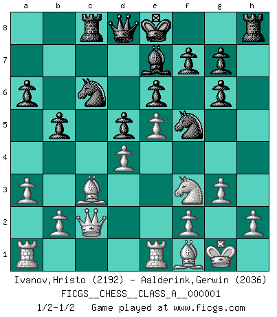 Last move : 1/2-1/2 2006 August 18 13:13:26 [Event "FICGS__CHESS__CLASS_A__000001"] [Site "FICGS"] [Date "2006.04.08"] [Round "1"] [White "Ivanov,Hristo"] [Black "Aalderink,Gerwin"] [Result "1/2-1/2"] [WhiteElo "2192"] [BlackElo "2036"] 1.e4 c6 2.d4 d5 3.e5 Bf5 4.Nf3 e6 5.Be2 Nd7 6.O-O Ne7 7.Nh4 Bg6 8.Nd2 c5 9.c3 cxd4 10.cxd4 Nf5 11.Nxg6 hxg6 12.Nf3 Be7 13.Bd3 Nb8 14.Bd2 Nc6 15.Bc3 a6 16.a3 Bg5 17.Re1 Bf4 18.g3 Bg5 19.Qb3 b5 20.Bf1 Be7 21.Qc2 Rc8 1/2-1/2 Caro-Kann : Advance variation Kingside Castling by player White (move 6) This chess game ended in a draw. Follow this game move after move (download)Is Bobby Fischer quite sane ? (Salo Flohr) Es liegt in der Natur, vernüftig zu denken und unlogisch zu handeln. (Anatole France) El Ajedrez es en su esencia, un juego. En su forma, un arte. Y en su ejecución, una ciencia. (Baron Tassilo) Même si l'adversaire joue le coup analysé précédemment, recommencez l'analyse en voyant la nouvelle position. Première règle de Blumenfeld The beginning is the most important part of the work. (Plato)