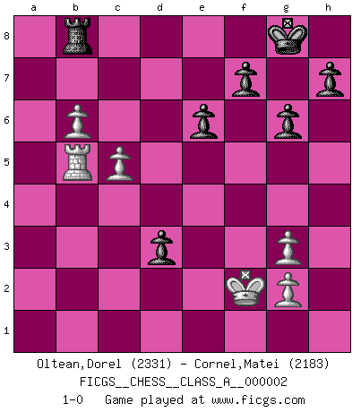 Last move : 1-0 2007 January 11 7:40:15 [Event "FICGS__CHESS__CLASS_A__000002"] [Site "FICGS"] [Date "2006.04.10"] [Round "1"] [White "Oltean,Dorel"] [Black "Cornel,Matei"] [Result "1-0"] [WhiteElo "2331"] [BlackElo "2183"] 1.Nf3 Nf6 2.c4 g6 3.Nc3 Bg7 4.e4 d6 5.d4 O-O 6.Be2 c5 7.O-O cxd4 8.Nxd4 Nc6 9.Be3 Bd7 10.Qd2 Rc8 11.f3 Nxd4 12.Bxd4 Bc6 13.Rab1 Nd7 14.Bf2 a5 15.b3 Nc5 16.a3 Be5 17.b4 axb4 18.axb4 Na4 19.Nxa4 Bxa4 20.b5 e6 21.Rfc1 Ra8 22.f4 Bf6 23.Bf3 Bg7 24.e5 dxe5 25.Qxd8 Rfxd8 26.Bxb7 Rab8 27.Ba6 Bh6 28.c5 Bxf4 29.Rc3 e4 30.Bg3 Bxg3 31.hxg3 Rd7 32.b6 Bc6 33.Bb5 Bxb5 34.Rxb5 Rd3 35.Rxd3 exd3 36.Kf2 1-0 Reti Opening Kingside Castling by player Black (move 5) Kingside Castling by player White (move 7) Player White won this chess game. Follow this game move after move (download)The Chess pieces are the block alphabet which shapes thoughts; and these thoughts, although making a visual design on the chessboard, express their beauty abstractly, like a poem. (Marcel Duchamp) Ich moechte nie einem Club beitreten, der Leute wie mich als Mitglieder aufnimmt. (Woody Allen) No hay un Gran Maestro de Ajedrez que sea normal; solo se diferencían ellos por la magnitud de su locura. (Viktor Korchnoi) La guerre est enfant de la passion, la passion est enfant du narcissisme et le narcissisme est l'enfant. (...) Une autre partie ? (Thibault de Vassal) It's unlucky to be superstitious. (Dave Enteles)