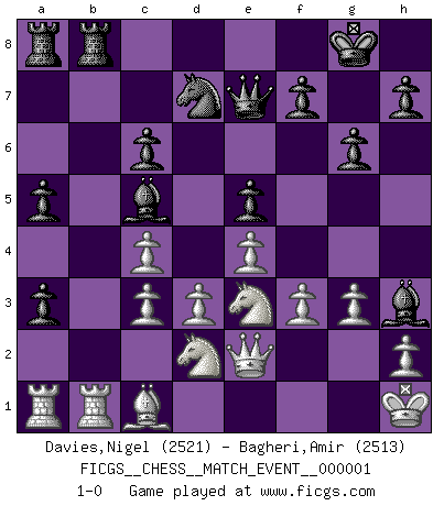 Last move : 1-0 2006 October 20 0:38:57 [Event "FICGS__CHESS__MATCH_EVENT__000001"] [Site "FICGS"] [Date "2006.06.19"] [Round "2"] [White "Davies,Nigel"] [Black "Bagheri,Amir"] [Result "1-0"] [WhiteElo "2521"] [BlackElo "2513"] 1.e4 c5 2.Nf3 Nc6 3.Bb5 Nf6 4.Qe2 e5 5.O-O Bd6 6.d3 a6 7.Bxc6 dxc6 8.Nbd2 b5 9.b3 O-O 10.Bb2 Re8 11.Nh4 g6 12.g3 Bg4 13.f3 Bh3 14.Rfe1 a5 15.a4 c4 16.bxc4 bxa4 17.Reb1 Bc5+ 18.Kh1 Nd7 19.Ng2 Qe7 20.Ne3 a3 21.Bc1 Reb8 22.c3 1-0 Sicilian : Nimzovich-Rossolimo attack (without ...d6) Kingside Castling by player White (move 5) Kingside Castling by player Black (move 9) Player White won this chess game. Follow this game move after move (download)Modern Chess is too much concerned with things like Pawn structure. Forget it, Checkmate ends the game. (Nigel Short) Ich suche im Schach immer etwas Eigenes. Riskantes Spiel im Stile schachlicher Musketiere ist nicht meine Sache, auch wenn es vielen Freunden scharfer Wendungen gefällt. (Anatoly Karpov) El Ajedrez, como cualquier actividad creativa, solo puede existir a través del esfuerzo combinado de aquellos que tienen talento creativo y de aquellos que poseen la habilidad de organizar su trabajo creativo. (Mikhail Botvinnik) Le profane ne songe pas à la somme de jouissance dont il se prive, qui méconnaît ce jeu aux ressources aussi variées que passionnantes. (Jean-Marie Jeanton-Lamarche) Two beer, or not two beer. (Unknown)