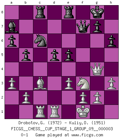 Last move : 0-1 2019 December 21 10:38:28 [Event "FICGS__CHESS__CUP_STAGE_1_GROUP_09__000003"] [Site "FICGS"] [Date "2019.11.02"] [Round "1"] [White "Drobotov,Gennady"] [Black "Kuliy,Oleksandr"] [Result "0-1"] [WhiteElo "1972"] [BlackElo "1951"] 1.d4 d5 2.Bg5 h6 3.Bd2 Nf6 4.e3 e6 5.c4 c5 6.Nf3 Nc6 7.cxd5 exd5 8.Be2 Bd6 9.dxc5 Bxc5 10.Qc2 Bd6 11.O-O O-O 12.Nc3 a6 13.h3 Be6 14.Rfd1 Re8 15.Rac1 Bc7 16.Na4 Ne4 17.Nc5 Nxc5 18.Qxc5 Qd7 19.Bc3 Rac8 20.Kf1 Bd6 21.Qb6 Bb8 22.Qb3 Ba7 23.Qa4 Bf5 24.Qh4 b5 25.a3 Be4 26.Nd2 Bf5 27.Nb3 Qd6 28.Bg4 Be6 29.Bxe6 fxe6 30.Qg4 Qe7 31.Nd2 Qf7 32.Nf3 e5 0-1 Levitsky attack (Queen's Bishop attack) Kingside Castling by player White (move 11) Kingside Castling by player Black (move 11) Player Black won this chess game. Follow this game move after move (download)Chess is a matter of delicate judgment, knowing when to punch and how to duck. (Bobby Fischer) Das Schach ist nichts für kleine Geister, es beansprucht einen vollen Mann, der sich nicht sklavisch an das Überlieferte hält, sondern selbständig die Tiefen des Spiels zu ergründen sucht. (Wilhelm Steinitz) Realmente no sabemos como el juego fue inventado, aunque hay sospechas. Tan pronto como descubramos a los culpables, se los haremos saber. (Bruce Pandolfini) Avec des compensations pour le matériel en plus... (Anonyme) First of all, we have to go back to the classical time control. (Anatoly Karpov)