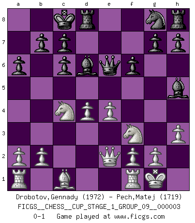 Last move : 0-1 2019 December 21 10:38:57 [Event "FICGS__CHESS__CUP_STAGE_1_GROUP_09__000003"] [Site "FICGS"] [Date "2019.11.02"] [Round "1"] [White "Drobotov,Gennady"] [Black "Pech,Matej"] [Result "0-1"] [WhiteElo "1972"] [BlackElo "1719"] 1.e4 e5 2.Nf3 Nc6 3.Bb5 a6 4.Bxc6 dxc6 5.O-O f6 6.d4 Bg4 7.c3 Bd6 8.h3 Bh5 9.Nbd2 Qe7 10.Nc4 O-O-O 11.Qe2 exd4 12.cxd4 Qe6 0-1 Ruy Lopez : Exchange, Gligoric variation Kingside Castling by player White (move 5) Queenside Castling by player Black (move 10) Player Black won this chess game. Follow this game move after move (download)The older I grow, the more I value Pawns. (Keres) Die jungen Leute sollen verstehen, dass sie noch etwas von mir lernen können und müssen. (Viktor Kortschnoi) El jugador de combinación piensa hacia adelante; comienza de la posición dada y trabaja las movidas contundentes en su mente. (Emanuel Lasker) Le jeu d'échecs est comme rejeté hors du temps. (Antoine de Saint-Exupéry) When you've done things right people won't know you've done anything at all. (Futurama)