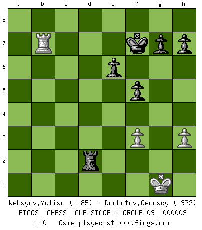 Last move : 1-0 2019 December 21 10:39:14 [Event "FICGS__CHESS__CUP_STAGE_1_GROUP_09__000003"] [Site "FICGS"] [Date "2019.11.02"] [Round "1"] [White "Kehayov,Yulian"] [Black "Drobotov,Gennady"] [Result "1-0"] [WhiteElo "1185"] [BlackElo "1972"] 1.d4 d5 2.e3 Nf6 3.Nf3 Nc6 4.c4 e6 5.c5 Be7 6.Be2 O-O 7.O-O b6 8.cxb6 axb6 9.Nc3 Bb7 10.b3 Bb4 11.Bb2 Ne4 12.Nxe4 dxe4 13.Nd2 f5 14.a3 Be7 15.h3 Qd5 16.Bc4 Qd7 17.f4 exf3 18.Nxf3 Na5 19.Rc1 Nxc4 20.bxc4 Bxa3 21.Bxa3 Rxa3 22.Qe2 Qe7 23.Ne5 Qg5 24.Nf3 Qxe3+ 25.Qxe3 Rxe3 26.c5 Rd8 27.cxb6 cxb6 28.Rfe1 Rxe1+ 29.Rxe1 Bxf3 30.gxf3 Kf7 31.Rb1 Rxd4 32.Rxb6 Rd2 33.Rb7+ 1-0 Queen's pawn game Kingside Castling by player Black (move 6) Kingside Castling by player White (move 7) 10 pieces endgame at move 32 : White KRPP , Black KRPPPP WHITE : King + 1 Rook 2 Pawns BLACK : King + 1 Rook 4 Pawns Player White won this chess game. Follow this game move after move (download)Combinations have always been the most intriguing aspect of Chess. The masters look for them, the public applauds them, the critics praise them. It is because combinations are possible that Chess is more than a lifeless mathematical exercise. They are the poetry of the game; they are to Chess what melody is to music. They represent the triumph of mind over matter. (Reuben Fine) Wenn sie aufgeben, dann danke ich Ihnen für das Spiel (Eventualzug beim Fernschach). (Anonymous) Diferente gente reacciona diferentemente en aceptar la derrota. (Bobby Fischer) Mais n'est-ce pas déjà le limiter injurieusement que d'appeler les échecs un jeu? N'est-ce pas aussi une science, un art, ou quelque chose qui, comme le cercueil de Mahomet entre ciel et terre, est suspendu entre l'un et l'autre, et qui réunit un nombre incroyable de contraires ? (Stefan Zweig) Without deviation from the norm, progress is not possible. (Frank Zappa)