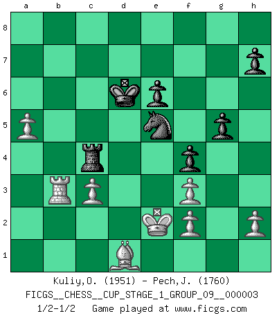 Last move : 1/2-1/2 2020 February 3 19:52:49 [Event "FICGS__CHESS__CUP_STAGE_1_GROUP_09__000003"] [Site "FICGS"] [Date "2019.11.02"] [Round "1"] [White "Kuliy,Oleksandr"] [Black "Pech,Jaroslav senior"] [Result "1/2-1/2"] [WhiteElo "1951"] [BlackElo "1760"] 1.e4 d5 2.exd5 Qxd5 3.Nc3 Qa5 4.d4 Nf6 5.Nf3 Bf5 6.Bc4 e6 7.Bd2 c6 8.Nd5 Qd8 9.Nxf6+ Qxf6 10.Qe2 Bg4 11.d5 Bxf3 12.gxf3 cxd5 13.Bxd5 Qxb2 14.O-O Nc6 15.Rab1 Qd4 16.Be4 Qd7 17.Rfd1 Be7 18.Qb5 Rd8 19.Qxb7 Qxb7 20.Rxb7 Ne5 21.Rxa7 Bg5 22.Kf1 Bxd2 23.Ke2 Rd7 24.Rxd7 Kxd7 25.Rxd2+ Kc7 26.Rd4 g5 27.c3 f5 28.Bc2 Ng6 29.a4 Ra8 30.Bb3 Ra6 31.Rc4+ Kd6 32.Rb4 Ne5 33.Bd1 Nc6 34.Rb5 Ne5 35.Ke3 Rc6 36.Rb3 Rc4 37.a5 f4+ 38.Ke2 1/2-1/2 Scandinavian defense Kingside Castling by player White (move 14) This chess game ended in a draw. Follow this game move after move (download)All that matters on the Chessboard is good moves. (Bobby Fischer) Wenn du auf das Glück wartest, wird das Leben ziemlich langweilig. (Mikhail Nekhemyevich Tal) Alguna parte de un error es siempre correcto. (Savielly Tartakover) Aux échecs, les retours au sommet sont rares : les dommages psychologiques consécutifs à une défaite sont trop sévères. (Daily Telegraph) Live, lose, and learn, by observing your opponent how to win. (Amber Steenbock)