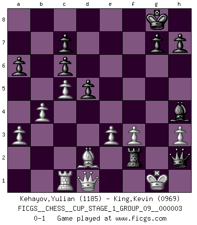 Last move : 0-1 2019 December 6 18:21:23 [Event "FICGS__CHESS__CUP_STAGE_1_GROUP_09__000003"] [Site "FICGS"] [Date "2019.11.02"] [Round "1"] [White "Kehayov,Yulian"] [Black "King,Kevin"] [Result "0-1"] [WhiteElo "1185"] [BlackElo "0969"] 1.d4 Nf6 2.e3 d5 3.Nf3 e6 4.c4 Bb4+ 5.Bd2 Be7 6.c5 O-O 7.b4 a6 8.a3 Ne4 9.Nc3 f5 10.Nxe4 fxe4 11.Ne5 Qe8 12.h3 Nc6 13.Nxc6 bxc6 14.Be2 e5 15.dxe5 Bh4 16.O-O Qxe5 17.f4 exf3 18.Bxf3 Bf5 19.Bg4 Be4 20.Rxf8+ Rxf8 21.Rc1 Rf2 22.Bf3 Bxf3 23.gxf3 Qh2+ 0-1 Queen's pawn game Kingside Castling by player Black (move 6) Kingside Castling by player White (move 16) Player Black won this chess game. Follow this game move after move (download)Chess is like life. (Boris Spassky) Es tut gut, die Entwicklungsperiode von, [...] demokratischem Geist durchdringen zu lassen. Wie undemokratisch wäre es doch beispielsweise, den einen Offizier große Spaziertouren vornehmen zu lassen, während die anderen zu Hause säßen und sich entsetzlich langweilten. (Aaron Nimzowitsch) El Ajedrez es un expediente tonto que hace creer a la gente inactiva que hacen una cosa muy astuta cuando solamente estan perdiendo su tiempo. (George Bernard Shaw) On entre au jeu d'Echecs comme on entre en Religion. Pour le joueur d'Echecs, la partie d'Echecs c'est l'office, la messe, le défilé du 1er Mai, le dépôt de gerbe au Monument aux Morts. C'est un drame sacré. (Michel Roos) Computers are like Old Testament gods; lots of rules and no mercy. (Joseph Campbell)