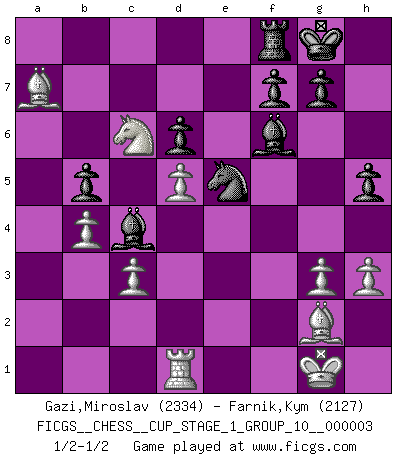 Last move : 1/2-1/2 2020 January 2 19:41:0 [Event "FICGS__CHESS__CUP_STAGE_1_GROUP_10__000003"] [Site "FICGS"] [Date "2019.11.02"] [Round "1"] [White "Gazi,Miroslav"] [Black "Farnik,Kym"] [Result "1/2-1/2"] [WhiteElo "2334"] [BlackElo "2127"] 1.e4 c5 2.Nf3 d6 3.d4 cxd4 4.Nxd4 Nf6 5.Nc3 a6 6.h3 e5 7.Nde2 h5 8.g3 Be6 9.Bg2 b5 10.O-O Nbd7 11.Be3 Be7 12.Nd5 Nxd5 13.exd5 Bf5 14.f4 Rc8 15.c3 Bh7 16.a4 O-O 17.axb5 axb5 18.Ra6 Ra8 19.Rxa8 Qxa8 20.fxe5 Nxe5 21.Nd4 Bg6 22.b3 Qa6 23.Nc6 Bf6 24.Qa1 Qb7 25.Qa7 Qxa7 26.Bxa7 Bc2 27.b4 Bd3 28.Rd1 Bc4 1/2-1/2 Sicilian : Najdorf, Adams attack Kingside Castling by player White (move 10) Kingside Castling by player Black (move 16) This chess game ended in a draw. Follow this game move after move (download)Of Chess it has been said that life is not long enough for it, but that is the fault of life, not Chess. (William Ewart Napier) Im Schach gewinnt jeder. Hat man Freunde am Spiel - und das ist die Hauptsache - ist auch der Verlust einer Partie kein Unglück. (David Bronstein) El Ajedrez demanda una total concentración. (Bobby Fischer) Le succès, c'est être capable d'aller d'échec en échec sans perdre son enthousiasme. (Winston Churchill) Difficult things take a long time, impossible things a little longer. (Author unknown)