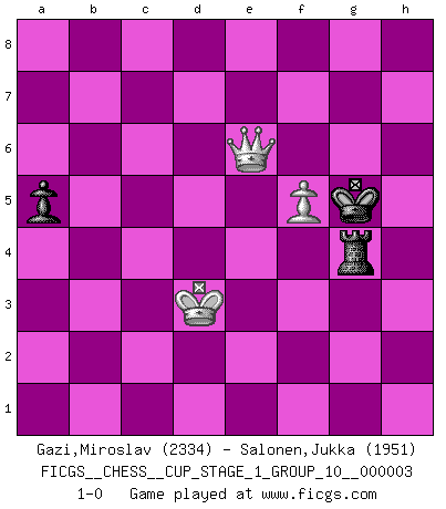 Last move : 1-0 2019 December 26 7:39:32 [Event "FICGS__CHESS__CUP_STAGE_1_GROUP_10__000003"] [Site "FICGS"] [Date "2019.11.02"] [Round "1"] [White "Gazi,Miroslav"] [Black "Salonen,Jukka"] [Result "1-0"] [WhiteElo "2334"] [BlackElo "1951"] 1.e4 e5 2.Nf3 Nc6 3.Bc4 Bc5 4.c3 Nf6 5.d3 d6 6.O-O a6 7.Re1 O-O 8.a4 Re8 9.Bg5 h6 10.Bh4 g5 11.Bg3 g4 12.Bh4 gxf3 13.Qxf3 Kg7 14.Nd2 Be6 15.Bd5 Bb6 16.h3 a5 17.d4 Nb8 18.Rad1 c6 19.Bxe6 Rxe6 20.Nc4 Qc7 21.d5 cxd5 22.Nxb6 Qxb6 23.exd5 Nxd5 24.Rxd5 Nc6 25.Red1 Qc7 26.R1d3 Ra6 27.Qe4 Rg6 28.Rg3 Rxg3 29.Bxg3 Rb6 30.Qg4+ Kf8 31.Qh5 Kg7 32.Rd3 Rxb2 33.Rf3 Qd7 34.Bh4 Qe6 35.Rf6 Qxf6 36.Bxf6+ Kxf6 37.Qxh6+ Ke7 38.Qg5+ Ke6 39.h4 Ne7 40.h5 b5 41.axb5 Rxb5 42.Qg4+ Kf6 43.Qd7 Rb6 44.g4 d5 45.g5+ Kxg5 46.Qxe7+ Kxh5 47.Qxf7+ Rg6+ 48.Kf1 d4 49.cxd4 exd4 50.f4 Kh6 51.f5 Rg4 52.Qe6+ Kg5 53.Ke2 d3+ 54.Kxd3 1-0 Giuoco Piano Kingside Castling by player White (move 6) Kingside Castling by player Black (move 7) 10 pieces endgame at move 46 : White KQPP , Black KRPPPP WHITE : King + 1 Queen 2 Pawns BLACK : King + 1 Rook 4 Pawns 9 pieces endgame at move 47 : White KQPP , Black KRPPP WHITE : King + 1 Queen 2 Pawns BLACK : King + 1 Rook 3 Pawns 8 pieces endgame at move 49 : White KQPP , Black KRPP WHITE : King + 1 Queen 2 Pawns BLACK : King + 1 Rook 2 Pawns 7 pieces endgame at move 49 : White KQP , Black KRPP WHITE : King + 1 Queen 1 Pawn BLACK : King + 1 Rook 2 Pawns 6 pieces endgame at move 54 : White KQP , Black KRP WHITE : King + 1 Queen 1 Pawn BLACK : King + 1 Rook 1 Pawn Player White won this chess game. Follow this game move after move (download)Robert Fischer is a law unto himself. (Larry Evans) Schachspieler können ausgezeichnet Varianten am Schachbrett berechnen, aber nicht im realen Leben. Zu stark ist der Individualismus im Schach ausgeprägt, und für viele ist ein kleiner momentaner persönlicher Vorteil wichtiger als ein weit größerer Vorteil von morgen. (Anatoly Karpov) Antes de los Finales, los dioses han colocado el Juego Medio. (Siegbert Tarrasch) Shah mat. Le roi est mort. Cri de fierté d'un joueur venant de terrasser son adversaire, courtoisement, sans effusion de sang. There will be no order, only chaos. (Sol Robeson in Pi by Darren Aronofsky)