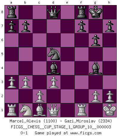 Last move : 0-1 2019 November 8 8:43:16 [Event "FICGS__CHESS__CUP_STAGE_1_GROUP_10__000003"] [Site "FICGS"] [Date "2019.11.02"] [Round "1"] [White "Marcel,Alexis"] [Black "Gazi,Miroslav"] [Result "0-1"] [WhiteElo "1100"] [BlackElo "2334"] 1.f4 d5 2.Nf3 g6 3.e3 Bg7 4.Be2 Nf6 5.b3 O-O 6.Bb2 c5 7.O-O Nc6 8.a3 d4 9.exd4 cxd4 10.d3 Nd5 11.Bc1 e5 12.fxe5 Nxe5 13.Nxd4 Ng4 14.Bxg4 Bxd4+ 15.Kh1 Bxg4 0-1 Bird's Opening Kingside Castling by player Black (move 5) Kingside Castling by player White (move 7) Player Black won this chess game. Follow this game move after move (download)The passed Pawn is a criminal, who should be kept under lock and key. Mild measures, such as police surveillance, are not sufficient. (Aaron Nimzovich) Rubinstein ist ein Turmendspiel, welches die Götter vor tausenden von Jahren begannen. (Savielly Grigorievitsch Tartakower) Preferería tener un Peón que un dedo. (Reuben Fine) Vous n'êtes pas toujours obligé de jouer le meilleur coup. Un coup doit être actif, entreprenant, correct et beau ! (David Bronstein) The good fighters of old first put themselves beyond the possibility of defeat, and then waited for an opportunity of defeating the enemy. (Sun Tzu)