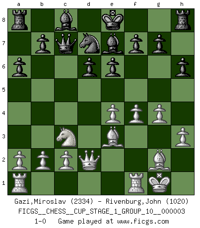 Last move : 1-0 2019 December 20 1:27:15 [Event "FICGS__CHESS__CUP_STAGE_1_GROUP_10__000003"] [Site "FICGS"] [Date "2019.11.02"] [Round "1"] [White "Gazi,Miroslav"] [Black "Rivenburg,John"] [Result "1-0"] [WhiteElo "2334"] [BlackElo "1020"] 1.e4 c5 2.Nf3 d6 3.d4 Nf6 4.Nc3 cxd4 5.Nxd4 a6 6.h3 e6 7.g4 h6 8.Bg2 Be7 9.Be3 Nc6 10.f4 Nd7 11.O-O Nxd4 12.Qxd4 Qc7 13.Qd2 1-0 This chess game has been lost on time (started : 2019.11.02 13:52:37) Sicilian Kingside Castling by player White (move 11) Player White won this chess game. Follow this game move after move (download)Every Chess master was once a beginner. (Chernev) Kostenjuk hat keinen Sexappeal. (Loek van Wely) Bobby Fischer es el jugador de Ajedrez mas grande que jamás haya existido. (Ken Smith) La conception d'un plan est le processus par lequel un joueur exploite les avantages de sa position tout en s'efforçant d'en réduire au minimum les inconvénients. Afin de garantir le succès, un plan doit toujours se fonder sur un diagnostic objectif des particularités d'une position. La conception d'un plan est d'autant plus difficile que la position est équilibrée, et grandement facilitée lorsqu'il n'existe qu'un seul plan susceptible de répondre aux exigences de la position. (Harry Golombek) Creativity involves breaking out of established patterns in order to look at things in a different way. (Edward De Bono)