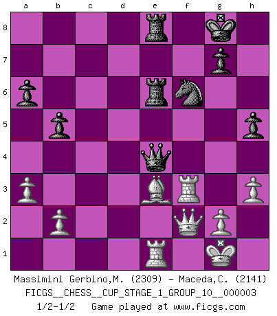 Last move : 1/2-1/2 2020 January 8 9:6:9 [Event "FICGS__CHESS__CUP_STAGE_1_GROUP_10__000003"] [Site "FICGS"] [Date "2019.11.02"] [Round "1"] [White "Massimini Gerbino,Massimiliano"] [Black "Maceda,Coco"] [Result "1/2-1/2"] [WhiteElo "2309"] [BlackElo "2141"] 1.d4 d5 2.c4 e6 3.Nc3 Nf6 4.Nf3 c6 5.e3 Nbd7 6.Bd3 dxc4 7.Bxc4 b5 8.Bd3 Bb7 9.O-O a6 10.e4 c5 11.d5 Qc7 12.dxe6 fxe6 13.Bc2 c4 14.Nd4 Nc5 15.Qe2 Bd6 16.f4 e5 17.Nf5 O-O 18.Rd1 Nd3 19.Nxd6 Qxd6 20.Bxd3 cxd3 21.Rxd3 Qc7 22.Rf3 Rae8 23.a3 exf4 24.Bxf4 Qe7 25.Re1 Bxe4 26.Nxe4 Qxe4 27.Be3 h5 28.h3 Re6 29.Qf2 Rfe8 1/2-1/2 QGD Semi-Slav : Meran variation Kingside Castling by player White (move 9) Kingside Castling by player Black (move 17) This chess game ended in a draw. Follow this game move after move (download)You can only get good at Chess if you love the game. (Bobby Fischer) Ich liebe den Moment, wenn ich das Ego meines Gegenüber breche. (Robert James Fischer) Fischer sacrificó virtualmente todo lo que la mayorÃa de nosotros los 'debiles' (término que él usa) valoramos, respetamos y apreciamos por el amor de un astuto, a menudo hermoso tablero de juego, por el privilegio ambivalente de ser su mas grande maestro. (Paul Kollar) Vous m'avez demandé de vous exposer quel est le fondement de la prière. Je ne fais que préparer les pièces du jeu sur la table... Nous sera-t-il permis d'en adopter les règles et si nous les appliquons scrupuleusement nous ne tarderons pas à faire mat le Roi divin ! Il ne pourra échapper à nos mains. (Sainte Thérèse d'Avila, Chemin de perfection) Empty your mind, be formless, shapeless — like water. (Bruce Lee)