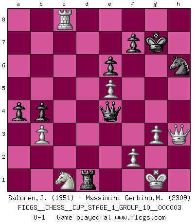 Last move : 0-1 2019 December 22 16:32:5 [Event "FICGS__CHESS__CUP_STAGE_1_GROUP_10__000003"] [Site "FICGS"] [Date "2019.11.02"] [Round "1"] [White "Salonen,Jukka"] [Black "Massimini Gerbino,Massimiliano"] [Result "0-1"] [WhiteElo "1951"] [BlackElo "2309"] 1.d4 d5 2.Nf3 Nf6 3.c4 e6 4.Nc3 c6 5.e3 Nbd7 6.Bd3 dxc4 7.Bxc4 b5 8.Bd3 Bb7 9.e4 b4 10.Na4 c5 11.e5 Nd5 12.dxc5 Nxc5 13.Nxc5 Bxc5 14.Qa4+ Kf8 15.O-O a5 16.Bd2 Qb6 17.Rac1 h6 18.Qd1 Ke7 19.Qc2 Rac8 20.Bc4 g6 21.Qe4 Ne3 22.Qf4 Nf5 23.Qg4 Rcd8 24.Bf4 g5 25.Bg3 Kf8 26.Rfd1 Rxd1+ 27.Rxd1 Be7 28.Qh5 Ng7 29.Qg4 h5 30.Qd4 Qc6 31.h4 Nf5 32.Qd7 Qxc4 33.Qxb7 gxh4 34.Bh2 Rg8 35.Ne1 Rg4 36.b3 Qe2 37.Qf3 Qxa2 38.Bf4 a4 39.Rd2 Qa3 40.Rc2 Kg7 41.Bc1 Qa1 42.Qa8 h3 43.g3 Bg5 44.Nd3 Qb1 45.Rc8 Nh6 46.Qf3 Rd4 47.Qxh5 Bxc1 48.Nxc1 Qe4 49.Qxh3 Rd1+ 0-1 Queen's pawn game Kingside Castling by player White (move 15) Player Black won this chess game. Follow this game move after move (download)One bad move nullifies forty good ones. (Horowitz) Wenn du nicht weißt was du tun sollst, warte bis dein Gegner eine Idee hat. Sie wird sicher schlecht sein. (Siegbert Tarrasch) Cada Peón es una Reina en potencia. (James Mason) Karpov est une pièce de musée. (Garry Kasparov) Games, world of games... There's always an opponent, and there's always a victim. (Revolver, movie)