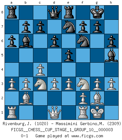 Last move : 0-1 2019 December 21 7:42:47 [Event "FICGS__CHESS__CUP_STAGE_1_GROUP_10__000003"] [Site "FICGS"] [Date "2019.11.02"] [Round "1"] [White "Rivenburg,John"] [Black "Massimini Gerbino,Massimiliano"] [Result "0-1"] [WhiteElo "1020"] [BlackElo "2309"] 1.c4 e5 2.Nc3 Nf6 3.Nf3 Nc6 4.g3 Bb4 5.Bg2 O-O 6.Nd5 Bc5 7.O-O d6 8.e3 Re8 9.b3 Bg4 10.h3 Bh5 11.d3 h6 12.Nc3 Bb6 13.Bb2 a6 14.a3 Ne7 0-1 This chess game has been lost on time (started : 2019.11.02 13:52:37) English Opening Kingside Castling by player Black (move 5) Kingside Castling by player White (move 7) Player Black won this chess game. Follow this game move after move (download)The Pawns are the soul of the game. (Francois Andre Danican Philidor) Sicherlich können nur Meister einen Stil haben. Daß ein nicht-Meister auch nur ein einziges Mal in seinem Leben eine Partie folgerecht durchführte, habe ich niemals bemerkt. (Emanuel Lasker) El Rey es una pieza de pelea. ¡Usenlo!. (Wilhelm Steinitz) Je ne crois pas en la psychologie, je crois aux bons coups. (Robert Fischer) The intuitive mind is a sacred gift; the rational mind is a faithful servant. We have created a society that honors the servant but has forgotten the gift. (Albert Einstein)