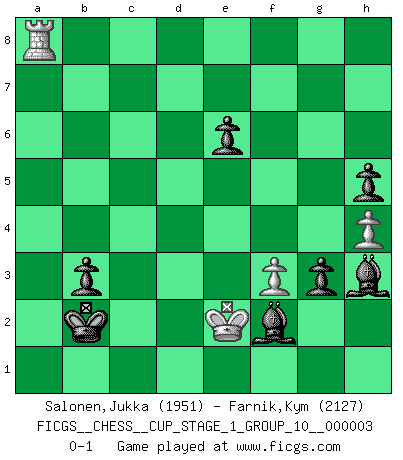 Last move : 0-1 2019 December 25 6:58:13 [Event "FICGS__CHESS__CUP_STAGE_1_GROUP_10__000003"] [Site "FICGS"] [Date "2019.11.02"] [Round "1"] [White "Salonen,Jukka"] [Black "Farnik,Kym"] [Result "0-1"] [WhiteElo "1951"] [BlackElo "2127"] 1.d4 Nf6 2.c4 g6 3.Nc3 d5 4.Bg5 Bg7 5.Nf3 Ne4 6.cxd5 Nxg5 7.Nxg5 e6 8.Qd2 h6 9.Nh3 exd5 10.Qe3+ Kf8 11.Nf4 Nc6 12.O-O-O h5 13.Qd2 Nxd4 14.e3 Ne6 15.Ncxd5 Nxf4 16.Qb4+ Qd6 17.Qxd6+ cxd6 18.Nxf4 g5 19.Nd5 Be6 20.h4 Rc8+ 21.Kb1 Rc5 22.Nb4 g4 23.Rxd6 Ke7 24.Rd2 a5 25.Nd3 Rd8 26.Be2 Rcd5 27.Rc1 R8d7 28.Rc8 Bf5 29.Kc2 g3 30.f3 Rxd3 31.Bxd3 Rxd3 32.Rxd3 Bxc8 33.Rd5 Bf6 34.b3 Be6 35.Rd1 b5 36.e4 Be5 37.Re1 Kd6 38.Rf1 Bd4 39.Kd3 Bf2 40.Rd1 Kc5 41.Rc1+ Kb4 42.Rc7 Ka3 43.Rb7 b4 44.Rb5 Kxa2 45.Rxa5+ Kxb3 46.Ra1 Kb2 47.Ra5 Bh3 48.e5 Bxg2 49.Ke2 b3 50.e6 fxe6 51.Ra8 Bh3 0-1 King's Indian defense, 3.Nc3 Queenside Castling by player White (move 12) Player Black won this chess game. Follow this game move after move (download)Fischer sacrificed virtually everything most of us weakies (to use his term) value, respect, and cherish, for the sake of an artful, often beautiful board game, for the ambivalent privilege of being its greatest master. (Paul Kollar) Der Bart als Geschlechtszeichen mitten im Gesicht ist obszön. Daher gefällt er den Weibern. [Zugegeben, kein Schachzitat, aber unglaublich originell] (Arthur Schopenhauer) El Ajedrez es la vida. (Bobby Fischer) Tous ces prétendus hommes politiques sont les pions, les Cavaliers, les Tours ou les Fous d'une partie d'échecs qui se jouera tant qu'un hasard ne renversera pas l'échiquier. (Honoré de Balzac) Never risk one's whole fortune unless supported by one's entire army. (Niccolo Machiavelli)