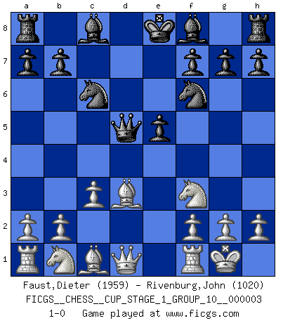 Last move : 1-0 2020 January 5 8:57:5 [Event "FICGS__CHESS__CUP_STAGE_1_GROUP_10__000003"] [Site "FICGS"] [Date "2019.11.02"] [Round "1"] [White "Faust,Dieter"] [Black "Rivenburg,John"] [Result "1-0"] [WhiteElo "1959"] [BlackElo "1020"] 1.e4 c5 2.Nf3 e6 3.d4 cxd4 4.Nxd4 Nf6 5.Bd3 Nc6 6.c3 d5 7.exd5 Qxd5 8.Nf3 e5 9.O-O 1-0 This chess game has been lost on time (started : 2019.11.02 13:52:37) Sicilian : Anderssen variation Kingside Castling by player White (move 9) Player White won this chess game. Follow this game move after move (download)I don't believe in psychology. I believe in good moves. (Bobby Fischer) Ein bischen Romantik kann weder im Schach noch in der Liebe schaden. Also versuche ich mich ab und zu daran zu erinnern. (Nigel Short) El Ajedrez era la lengua materna de Capablanca. (Reti) Ce qui caractérise les parties de combat, c'est que si le défenseur a constamment de difficiles problèmes à résoudre, l'attaquant doit chercher sans relâche de nouvelles possibilités d'attaque. (Koblentz) Waiting for chance ? Play in casinos. (FICGS proverb)